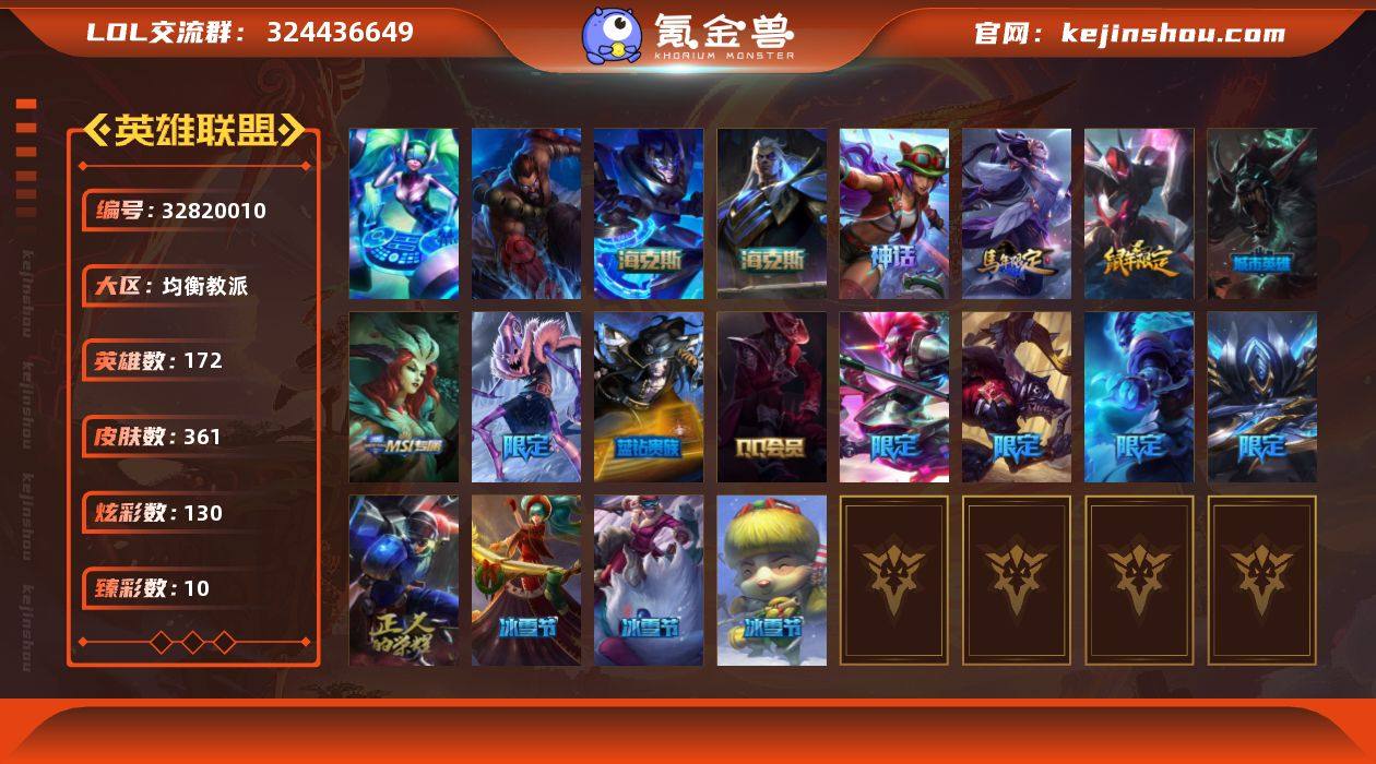t38523【均衡教派】361皮肤 130炫彩 10臻彩 5神话/48限定/39传说/172英雄 账号等级:732 【重要头像】雪花 两仪无极 【重要皮肤】海克斯科技斯维因 海克斯科技嘉文四世 胜利行刑官德莱文 胜利女神希维尔 胜利之王泰达米尔 舞会公主安妮 荣誉使者玛尔扎哈 银龙裁决泰隆 广寒仙子嫦娥 胜利女神瑟庄妮 胜利机器人布里茨 胜利枪神卢锡安 黯然心伤阿木木 魄罗骑士瑟庄妮 平安夜女神娑娜 圣诞糖果棒厄运小姐 电玩战魂赫卡里姆 SKTT1阿利斯塔 SKTT1瑞兹 SSW泰隆 SSW辛吉德 SKTT1婕拉 暗杀星奥莉安娜 暗杀星蒙多 Fnatic迦娜 Fnatic古拉加斯 防暴天使凯尔 冠军典狱长锤石 冠军掠夺者卡兹克 鬼影重重魔腾 红桃杰克崔斯特 胡桃夹子萨科 蓝色忧郁崔斯特 南瓜头费德提克 圣诞精灵崔丝塔娜 圣诞开心鬼提莫 圣诞狂欢基兰 圣诞狂欢努努和威朗普 圣诞老人古拉加斯 圣诞玩偶波比 圣诞驯鹿克格莫 糖果使徒费德提克 无头骑士赫卡里姆 雪默丁格 永恒之森乐芙兰 暗影沃里克 阿木木主人不要我了 都铎王朝图奇 十五周年纪念希维尔 十周年纪念安妮 神凰行者瑞羽圣凰艾尼维亚 机神朱雀蕾欧娜 DJ娑娜 灵魂守卫乌迪尔 绝息圣堂洛 【传说皮肤】...