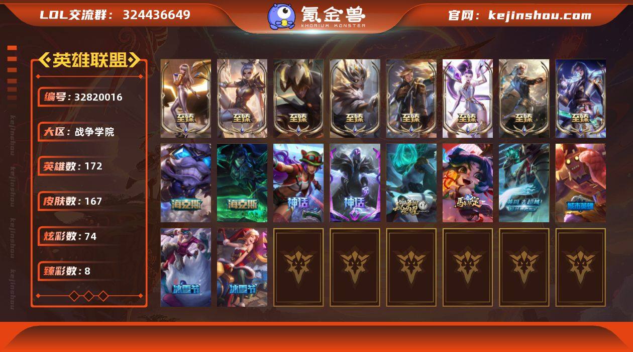 t38543【战争学院】167皮肤 74炫彩 8臻彩 16神话/27限定/14传说/172英雄 账号等级:518 单双排段位:铂金 【重要头像】美猴王孙悟空 圣诞捣蛋鬼金克丝 【重要皮肤】心之钢永恩至臻 魔女婕拉至臻 灵能特工伊泽瑞尔至臻 黑夜使者凯隐至臻 KDA二代卡莎至臻 KDA一代卡莎至臻 玉剑传说武剑仙至臻 黑夜使者李青至臻 黑夜使者李青2022至臻 灰烬骑士派克 海克斯科技吉格斯 摄魂使者薇恩 胜利行刑官德莱文 胜利剑圣易 胜利女神娑娜 胜利之王泰达米尔 胜利巨口克格莫 荣誉使者玛尔扎哈 玉剑传说舞龙卫 点心宝贝阿木木 龙马烈焰波比 胜利机器人布里茨 胜利枪神卢锡安 胜利之剑亚托克斯 魄罗骑士瑟庄妮 魅惑女巫迦娜 大魔王提莫 克烈古拉伯爵 海之歌艾希 冰雪节辛吉德 春晖神女艾希 鬼影森森茂凯 胡桃夹子萨科 蒙多蒙多 南瓜头费德提克 邪恶圣诞老人维迦 地底世界崔斯特 十五周年纪念希维尔 十周年纪念安妮 源代码乐芙兰 神凰行者瑞羽圣凰艾尼维亚 暗裔英雄盖伦 【传说皮肤】霸天异形卡兹克 邪鸦魅影乐芙兰 血石领主弗拉基米尔 恶魔之刃泰达米尔 星之守护者霞 黯黑魔龙希瓦娜 绅士科加斯 陆地王者4WD布里茨 苍穹之光韦鲁斯 鬼魂新...