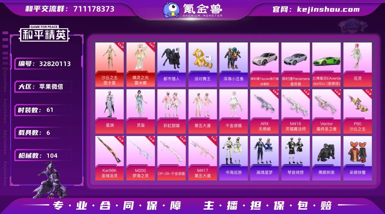【店主推荐捡漏号!可直接换绑】苹果 微信-3神装-9粉装-16特效枪-6载具-13粉色飞行器-48732热力值-2王牌印记-61套装-104枪皮【红色神装等级】:暮色玫影-艾丽娅(一级),精灵之光-露米娜(一级),沙丘之主-图卡盟(二级)【红色角色神装】:暮色玫影-艾丽娅,精灵之光-露米娜,沙丘之主-图卡盟【热门品类】:套装-浪漫天命,套装-都市猎人,套装-派对舞王,套装-深海小丑鱼,套装-暗影哥特,套装-红熊茄茄【粉色套装】:粉装-彩虹甜喵,粉装-第五大道,角色-千金淑猫,角色-花灵,角色-星渊,角色-灵玺,角色-罪夜之冕,角色-精灵菇菇,角色-虎痴许褚【粉色枪皮等级】:AKM-暮色玫影(三级),M416-灵猫魔法师(三级),AUG-罪夜之冕(三级),ARX-无垠阁(四级),UMP45-萌骑冒险(二级),Vector-最终圣卫者(三级),AKS-74U-森灵之息(五级),P90-沙丘之主(三级),Kar98K-圣域龙灵(三级),M24-虎痴许褚(一级),Mk14-福马献瑞(五级),M417-第五大道(一级),M200-梦海之灵(三级),M249-霁蓝缠春(二级),DP-28-千金淑猫(二级),破片手榴弹-招财进宝(四级)【粉色载具】:兰博基尼Aventador SVJ(翡翠绿),保时捷Taycan 旅行版(冰莓粉),保时捷Panamera(星辰紫),僚机-圣域龙宝,暮色幽蹄,...