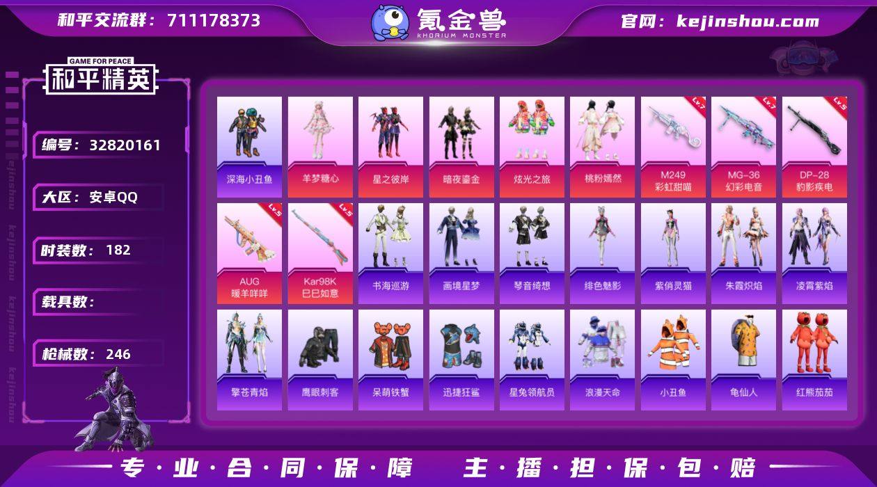 J2929 【性价比特效枪号】5粉 7特 深海小丑鱼 小丑鱼 浪漫天命 星之彼岸 羊梦糖心 桃粉嫣然 满级枪*7 地铁满天赋 收藏家等级70 安卓 手Q-5粉装-7特效枪-0载具-4粉色飞行器-74448热力值-18王牌印记-182套装-246枪皮 【热门品类】:套装-浪漫天命,套装-深海小丑鱼,套装-小丑鱼,套装-龟仙人,套装-红熊茄茄 【粉色套装】:粉装-星之彼岸,粉装-暗夜鎏金,粉装-炫光之旅,粉装-桃粉嫣然,角色-羊梦糖心 【粉色枪皮等级】:AUG-暖羊咩咩(五级),UMP45-萌骑冒险(五级),Kar98K-巳巳如意(五级),Mk14-福马献瑞(五级),M249-彩虹甜喵(七级),DP-28-豹影疾电(五级),MG-36-幻彩电音(七级) 【粉色枪皮】:AUG-暖羊咩咩,UMP45-萌骑冒险,Kar98K-巳巳如意,Mk14-福马献瑞,M249-彩虹甜喵,DP-28-豹影疾电,MG-36-幻彩电音 【粉色飞行器】:炫彩糖果飞行器,星之彼岸飞行器,镜光幻境飞行翼,极意拳锋飞行器 【粉色降落伞】:极限特训降落伞,幻影战神降落伞,未来战士降落伞,梦幻火箭降落伞,星之彼岸降落伞,枪炮玫瑰降落伞,暗夜玫瑰降落伞,洛神天依降落伞,垂柳戏鸭降落伞,太空嘟嘟降落伞,彩虹甜喵降落伞,旋转彩虹降落伞,暗夜鎏金降落伞,音爆索尼克降落伞,仲夏莫吉托降落...