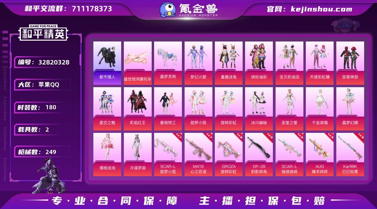 【特价出售/店主推荐】/绝世印记1 苹果 手Q-17粉装-10特效枪-2载具-4粉色飞行器-82472热力值-17王牌印记-180套装-249枪皮【热门品类】:粉装-梦幻火箭,粉装-童趣迷兔,粉装-缤纷油彩,套装-浪漫天命,套装-都市猎人,套装-龟仙人【粉色套装】:粉装-宝贝奶油派,粉装-天使彩虹糖,粉装-梦幻火箭,粉装-缤纷油彩,粉装-放客神游,粉装-星空之魅,粉装-童趣迷兔,粉装-炙焰红王,粉装-蜜桃特工,粉装-甜梦小狐,粉装-旋转彩虹,粉装-冰川幽秘,角色-圣堂之誓,角色-千金淑猫,角色-晶梦幻蝶,角色-樱桃泡泡,角色-冷漠罗丽【粉色枪皮等级】:SCAR-L-甜梦小狐(七级),SCAR-L-锦绣绵绵(五级),M416-心之恋语(七级),GROZA-旋转彩虹(六级),AUG-暖羊咩咩(五级),UMP45-萌骑冒险(五级),Kar98K-巳巳如意(五级),Mk14-盛世惊鸿(三级),Mk14-福马献瑞(四级),DP-28-豹影疾电(五级)【粉色载具】:盛世惊鸿摩托车,晶梦灵驹【粉色枪皮】:SCAR-L-甜梦小狐,SCAR-L-锦绣绵绵,M416-心之恋语,GROZA-旋转彩虹,AUG-暖羊咩咩,UMP45-萌骑冒险,Kar98K-巳巳如意,Mk14-盛世惊鸿,Mk14-福马献瑞,DP-28-豹影疾电【粉色飞行器】:酣梦熊熊飞行器,祥瑞起舞飞行器,凤舞九天飞行器,极意拳锋飞...