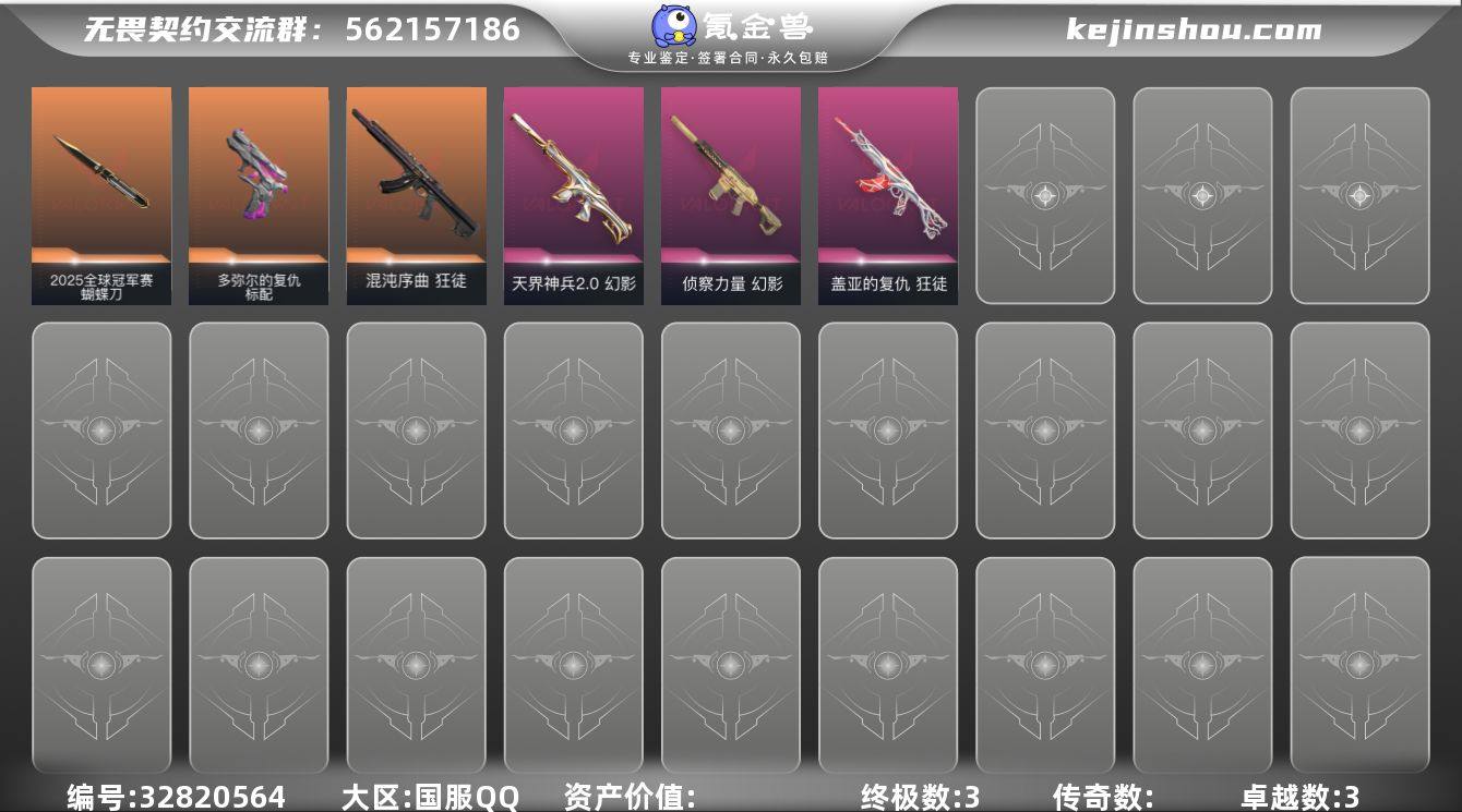 【WWQH458】终极*3/卓越*3/皮肤*13/等级*20/段位:未定级/炼狱/暮蝶/捷风/幽影/不死鸟/贤者/猎枭/芮娜/2025全球冠军赛 蝴蝶刀/狂徒-混沌序曲/狂徒-盖亚的复仇/幻影-天界神兵2.0/幻影-侦察力量/多弥尔的复仇 标配/代号红色 卡面/新兵报到 卡面/V契约 卡面/无畏契约 卡面/胜利属于无畏契约 喷漆/GLHF 喷漆/无畏契约 喷漆/无畏契约 纪念币 挂饰