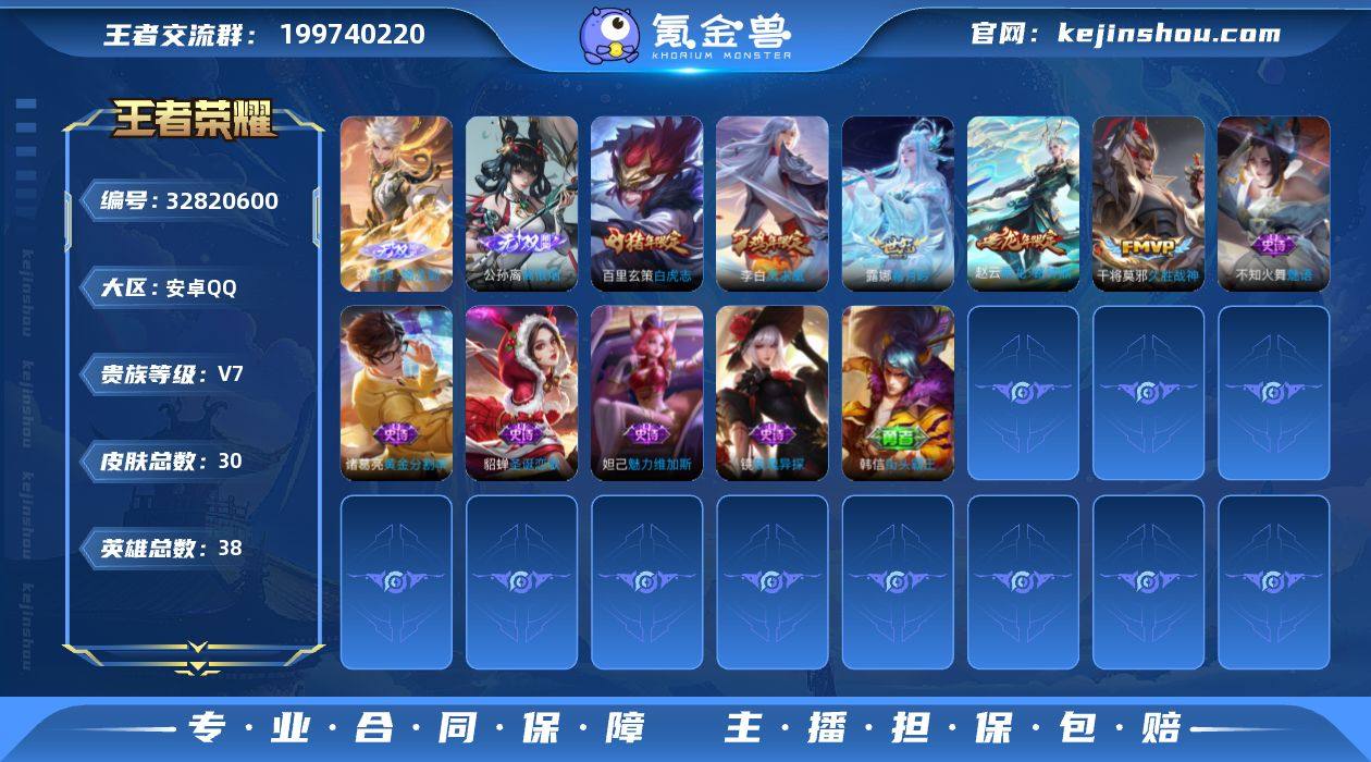 【精品小号·器灵螭龙剑·离恨烟·神骥越千峰·神骥逐星野·乘龙铭钟鼎·白虎志·霜月吟·凤求凰·无二次包过】w21980-安卓Q-38英雄-30皮肤-1王者印记-0铭文-贵族积分2w【贵族7】【2无双·珍品·星传说·7传说·1按键】【因赛季更新游戏段付以上号为准!】 【英雄全皮】:孙权全皮 【无双皮肤】:曜器灵螭龙剑,公孙离离恨烟 【传说皮肤】:云缨神骥越千峰,马超神骥逐星野,赵云乘龙铭钟鼎,露娜霜月吟,干将莫邪久胜战神,百里玄策白虎志,李白凤求凰 【限定皮肤】:公孙离离恨烟,暃埋骨钱,狄仁杰阴阳师,赵云皇家上将,狄仁杰魔术师,项羽海滩派对,百里玄策白虎志,妲己灵卜魔法,赵云乘龙铭钟鼎 【年限皮肤】:李白凤求凰,百里玄策白虎志,赵云乘龙铭钟鼎 【战令限定】:妲己灵卜魔法,周瑜线条小狗,小乔线条小狗 【史诗皮肤】:周瑜线条小狗,小乔线条小狗,暃埋骨钱,妲己灵卜魔法,镜玫瑰异探,不知火舞魅语,诸葛亮黄金分割率,妲己魅力维加斯,狄仁杰魔术师,貂蝉圣诞恋歌,赵云皇家上将,露娜紫霞仙子 【其他皮肤】:蚩奼极光幻客,孙权径山谋武,妲己灵卜魔法,王昭君幻想奇妙夜,狄仁杰阴阳师,安琪拉玩偶对对碰,赵云忍炎影,韩信街头霸王,项羽海滩派对,铠龙域领主