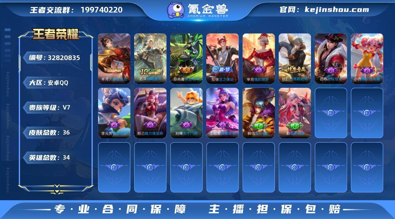 实名: 不可修改 贵族等级: V7 英雄数: 34 皮肤数: 36 荣耀水晶: 大秦宣太后 传说皮: 末日机甲-孙尚香,神树通天