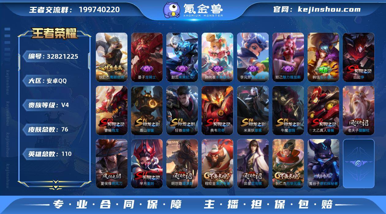 实名: 可修改 贵族等级: V4 英雄数: 110 皮肤数: 76