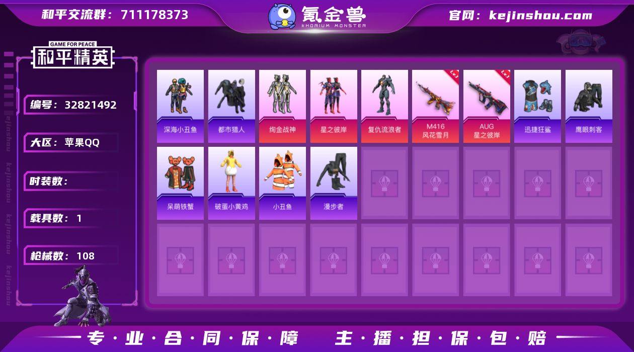 DYH18051【身法号1载具-6粉装-10特效枪 深海小丑鱼,小丑鱼,都市猎人 M4风花雪月 AUG星之彼岸】 无二次-苹果手Q-1载具-6粉装-10特效枪-62套装-108枪皮-4王牌印记-超级王牌6星-33576热力值【1载具】辉羽雀灵自行车【6粉装】角色-复仇流浪者,极意拳锋,绚金战神,星穹咏叹调,星之彼岸,幻彩电音【10特效枪】DP-28-豹影疾电[5级],Kar98K-巳巳如意[4级],Mk14-福马献瑞[5级],MG-36-幻彩电音[4级],AKS-74U-森灵之息[5级],AMR-智耀战神[1级],MG3-辉羽雀灵[3级],AKM-幻海仙踪[6级],AUG-星之彼岸[5级],M416-风花雪月[5级]【4稀有】深海小丑鱼,小丑鱼,都市猎人,AKM-缤纷海域【8飞行器】马上有福飞行器,破刃行动尾迹,雀灵庇佑飞行器,粉色滑翔尾迹,星之彼岸飞行器,狂鲨锋刃飞行器,鸡智如我飞行器,异域银装飞行器【1头盔】深海小丑鱼头盔【1背包】深海小丑鱼背包【150其它衣服和枪皮】破蛋小黄鸡,长空猛禽,福马献瑞,薄荷星砂,漫步者,角色-瑰梦爱神,玩偶服-喜羊羊,粉恋花,SS32特训,角色-乐音,竞技名士,萌鸡速递,引力深渊,紫幽梦,擎苍青焰,雪国风尚,缤纷果语,战术大师,SS37特训,绯格组合,角色-时希公主,星渊小夜曲,白糯汤圆,湖蓝色名流,SS36特训,青翼流星,角色-绯色魅影,SS35特训,大橘大利,弄潮海...