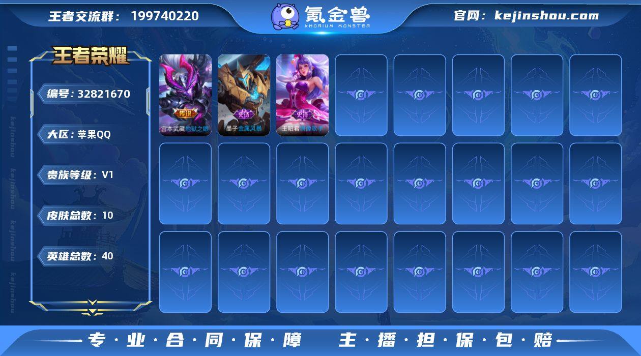 实名: 可修改 贵族等级: V1 英雄数: 40 皮肤数: 10 传说皮: 地狱之眼
