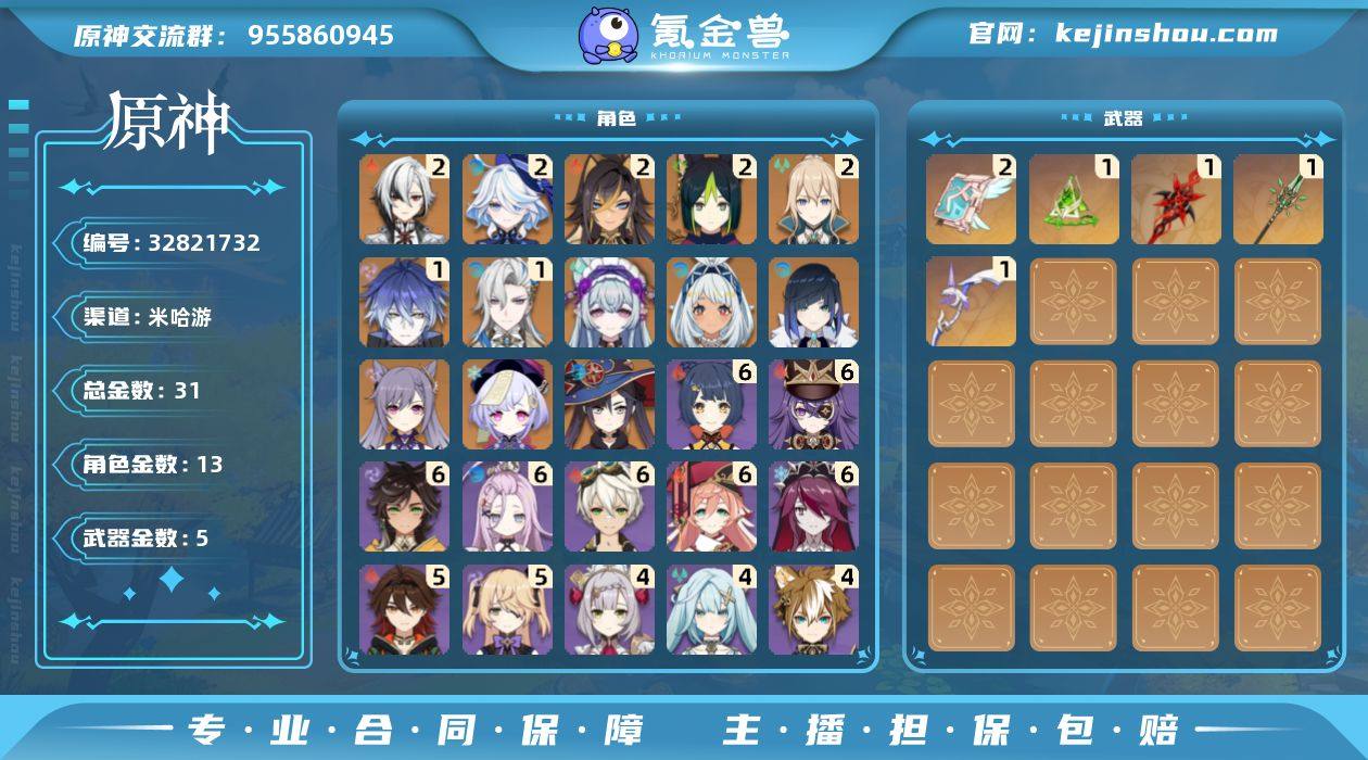 31黄!2+1仆人!2命芙宁娜!1命菲林斯!1命龙王!夜兰!玛拉妮! 冒险等级: 58 2命金色角色: 二命琴,二命提纳里,二命迪希雅,二命芙宁娜,二命阿蕾奇诺 1命金色角色: 一命那维莱特,一命菲林斯 0命金色角色: 七七,刻晴,莫娜,夜兰,玛拉妮,梦见月瑞希 拥有武器: 天空之卷,和璞鸢,阿莫斯之弓,赤月之形,真语秘匣 2精武器: 天空之卷 1精武器: 和璞鸢,阿莫斯之弓,赤月之形,真语秘匣