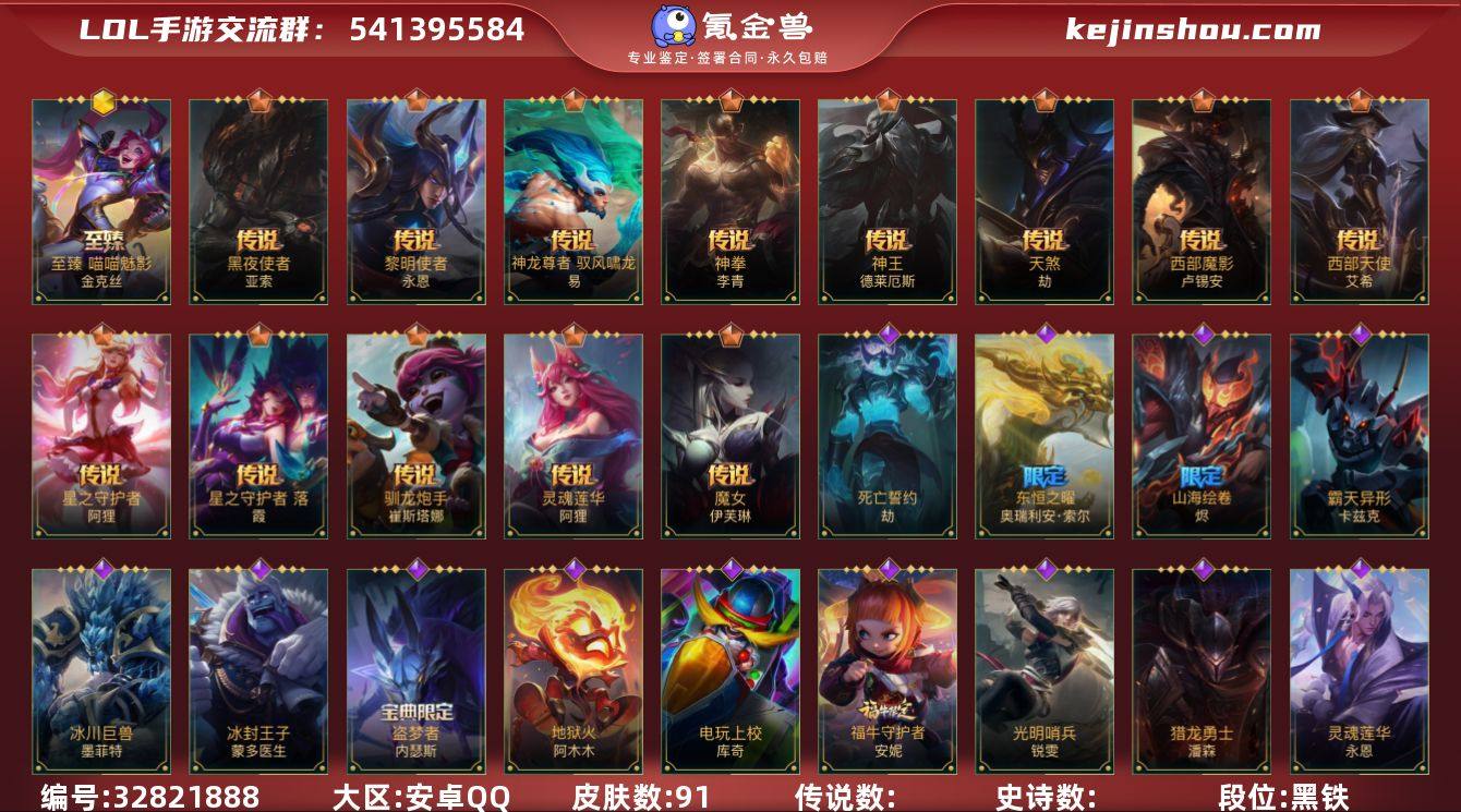 实名: 不可修改 段位: 黑铁 皮肤数: 91 神话皮: 至臻喵喵魅影金克丝 限定皮肤: 山海绘卷烬 传说皮: 黑夜使者亚索,神龙尊者 驭风啸龙,神拳盲僧,神王诺手,天煞劫,西部魔影卢锡安,西部天使寒冰,星之守护者阿狸,星之守护者 落,驯龙炮手,黎明使者永恩,灵魂莲华阿狸,魔女伊芙琳 亮点: 【LSC567】99英雄/91皮肤/流光翡翠/至臻喵喵魅影金克丝/山海绘卷烬/魔女伊芙琳/黑夜使者亚索/星之守护者阿狸/灵魂莲华阿狸/天煞劫/西部魔影卢锡安/驯龙炮手/星之守护者 落/神拳盲僧/黎明使者永恩/神龙尊者 驭风啸龙/神王诺手/西部天使寒冰/霸天剑魔亚托克斯/星之守护者拉克丝/地狱火阿木木/摄魂猎手凯隐/星之守护者发条/霸天异形螳螂/蕊雪盈春:晏安 赫卡里姆/东恒之曜奥瑞利安索尔/神龙尊者 玉境灵龙/猎龙勇士潘森/玉剑传说 无双/福牛守护者安妮/战场之王亚索/幻梦甜心阿狸/死亡誓约劫/灵能特工劫/泳池派对蕾欧娜/泳池派对璐璐/太空律动璐璐/源计划:裁决/星域审判官/电玩上校/奈落之炎/冰封王子/盗梦者/破败军团女枪/灵魂莲华永恩/破败军团德莱文/冰川巨兽石头人/暗星墨菲特/光明哨兵锐雯/星之守护者EZ/神奇先驱杰斯/灵能特工莎弥拉/鳄霸 雷克顿/星之守护者赛娜/北极星寒枳 莉莉娅/s1光耀之刃/s2...