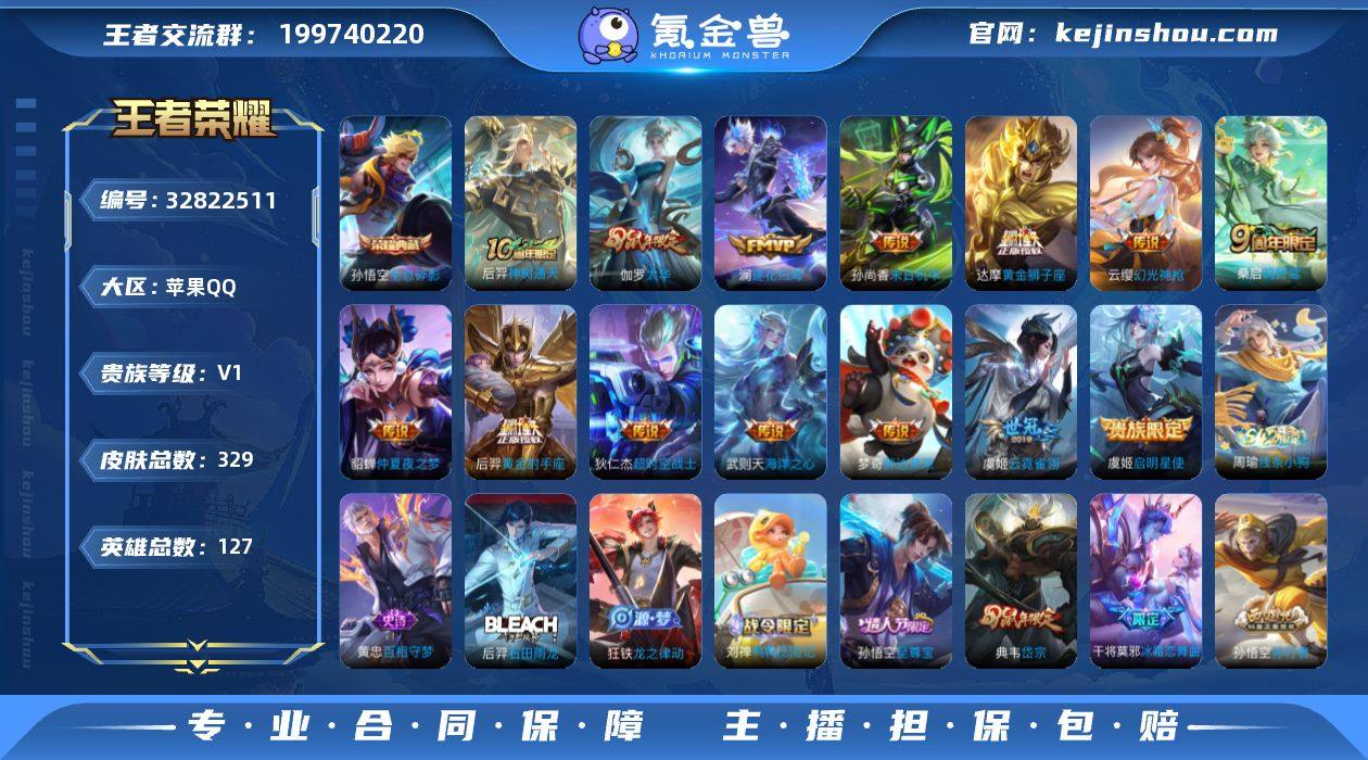 实名: 可修改 性别: 男号 贵族等级: V1 英雄数: 127 皮肤数: 329 荣耀水晶: 全息碎影 传说皮: 黄金狮子座,黄金射手座,云霓雀翎,末日机甲-孙尚香,仲夏夜之梦,海洋之心,胖达荣荣,超时空战士-狄仁杰,澜逐花归海,幻光神枪,神树通天 限定皮: 李小龙,梁祝,烈魂,岱宗,飞衡,太华,天狼狩猎者,冰霜恋舞曲,逐梦之影,至尊宝,孙行者,五谷丰年,鸣野蒿,逐霄战戟 亮点: 【优质装备】:全息碎影(猴子典藏),黄金狮子座,黄金射手座,云霓雀翎,末日机甲-孙尚香(绿蚂蚱),仲夏夜之梦(大飞蛾),海洋之心,胖达荣荣,超时空战士-狄仁杰,澜逐花归海