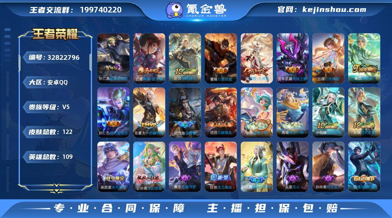 安卓Q-V5-最强王者段位-109英雄-122皮肤-9传说-35史诗 【英雄全皮】:孙权全皮,敖隐全皮 【传说皮肤】:云缨神骥越千峰,后羿神树通天,曹操万灵伏威,澜愿照九州拓,云缨幻光神枪,桑启鸣野蒿,东皇太一灼幽烈阳,宫本武藏地狱之眼,狄仁杰超时空战士 【限定皮肤】:姜子牙天穹之誓,狄仁杰阴阳师,赵云皇家上将,元歌无心,项羽海滩派对,鲁班大师探海日志,桑启海盐诗旅,鬼谷子天穹祈灯,沈梦溪龙舞盛年,刘邦剑破天穹,程咬金群星魔术团,周瑜熔金海岸 【年限皮肤】:澜愿照九州拓 【赛季限定】:桑启海盐诗旅,鲁班大师探海日志,鬼谷子天穹祈灯,刘邦剑破天穹,姜子牙天穹之誓,东皇太一噬灭天穹,太乙真人谧流熔炉,钟馗虚灵犬护,甄姬逆浪荇歌,亚瑟荣光之誓,牛魔星界战将,项羽九幽镇关 【战令限定】:莱西奥光弋星穹,明世隐往忆晖光,周瑜线条小狗,小乔线条小狗 【史诗皮肤】:明世隐百晓客,周瑜线条小狗,小乔线条小狗,项羽九幽镇关,少司缘巫礼祀神,女娲万灵启世,莱西奥光弋星穹,公孙离涂山容容,黄忠百相守梦,狂铁龙之律动,赵怀真器灵浮梦炉,弈星万物之道,牛魔星界战将,元歌无心,沈梦溪月团寄思,杨戬天秀启明,孙尚香时之恋人,小乔青蛇,狄仁...