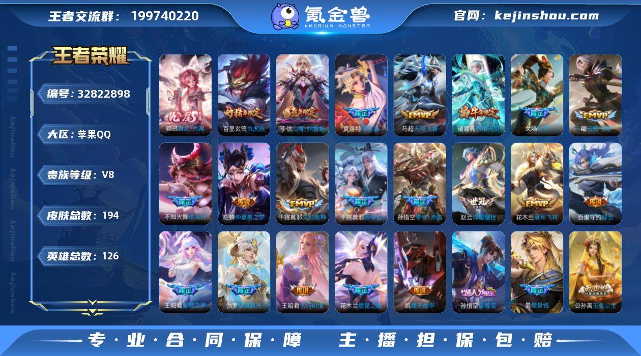 说 126英雄 194皮肤 可修改实名 男号 【英雄全皮】空空儿全皮,孙权全皮,夏洛特全皮,大禹全皮 【稀有英雄】大司命,韩信(韩跳跳),夏洛特(夏师傅),艾琳,橘右京(橘子),娜可露露(鸟人),不知火舞,赵云,金蝉(唐僧),戈娅 【无双皮】青丘·九尾(妲己无双) 【传说皮】神骥·赴朔漠,山海·炽霜斩(李信年限),零号·赤焰,仲夏夜之梦(大飞蛾),淬星耀世,冠军飞将,久胜战神,云鹰飞将(小将军),无双飞将,乞巧织情,绛天战甲(鸡嘴战神),超时空战士-狄仁杰,碎云,炽翼辉光(娃娃菜牛角包),燃星之曲,画中仙,浮生妄,青丘·九尾,百相守梦(张飞) 【珍宝阁皮】妄想食味,蔷薇恋人 【赛季/战令皮】噬灭天穹(s37),古海寻踪(s33),海盐诗旅(s30),擒涛扼浪(s31),探海日志(s32),剑破天穹(s35),天穹祈灯(s34),天穹之誓(s36),混沌棋(s18),疑决卦(s19),醍醐杖(s20),原初探秘者(s21),万华元夜(s22),演武夺筹(s23),驱傩正仪(s24),夺宝奇兵,迷踪丽影,西部大镖客-猪八戒,暗影游猎(游乐娃子),单词大作战,狂想玩偶喵,潮玩骑士王,云间偶戏,星际陆战队-达摩,胡桃异想国,沙漠行僧(s26),金庭之子(s27),云中旅人(s29) 【史诗皮】百晓客,埋骨钱,线条小狗-周瑜,线条小狗-小乔,电玩小子(小书包),白龙吟,永昼,百相守梦(刘备),青蛇,偶像歌...