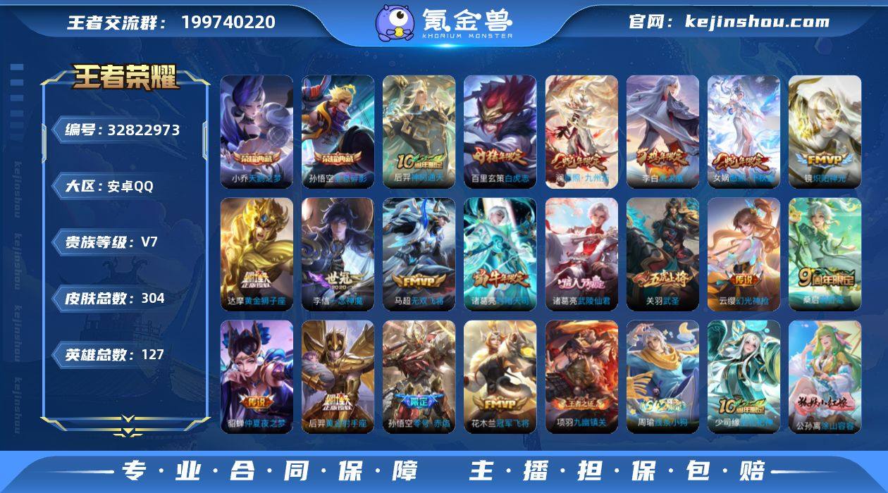 【孙悟空小乔典藏19个高质量传说多限定年限8个个性按键】安卓Q-V7-永恒钻石I段位-127英雄-304皮肤-2典藏皮肤-19传说-87史诗【荣耀典藏】:孙悟空全息碎影,小乔天鹅之梦【传说皮肤】:后羿神树通天,女娲愿照千秋盛,澜愿照九州拓,云缨幻光神枪,桑启鸣野蒿,马超无双飞将,孙尚香异界灵契,诸葛亮时雨天司,镜炽阳神光,孙悟空零号赤焰,关羽武圣,李信一念神魔,达摩黄金狮子座,百里玄策白虎志,花木兰冠军飞将,后羿黄金射手座,诸葛亮武陵仙君,貂蝉仲夏夜之梦,李白凤求凰【限定皮肤】:姜子牙天穹之誓,狄仁杰阴阳师,赵云皇家上将,墨子神迹守卫,嬴政白昼王子,孙尚香蔷薇恋人,孙尚香异界灵契,鲁班七号狮舞东方,庄周高山流水,高渐离玩趣恶龙,孙膑天狼运算者,芈月白晶晶,吕布猎兽之王,周瑜赤莲之焰,元歌云间偶戏,元歌无心,夏侯惇朔风刀,曹操天狼征服者,典韦穷奇,典韦蓝屏警告,马可波罗逐梦之星,马可波罗暗影游猎,狄仁杰魔术师,狄仁杰万华元夜,达摩沙漠行僧,项羽海滩派对,老夫子醍醐杖,老夫子航海奇遇记,关羽冰锋战神,关羽武圣,程咬金演武夺筹,兰陵王驯魔猎人,兰陵王金庭之子,花木兰默契交锋,亚瑟潮玩骑士王,孙悟空至尊宝,孙悟空大圣...