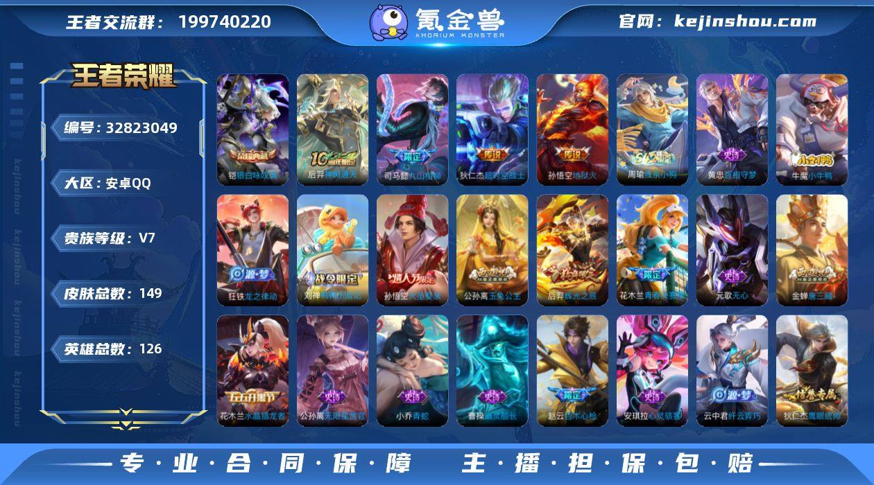 实名: 可修改 性别: 男号 贵族等级: V7 英雄数: 126 皮肤数: 149 荣耀水晶: 银白咏叹调 传说皮: 地狱火,超时空战士-狄仁杰,九山相柳,神树通天 限定皮: 游园惊梦,辉光之辰,虎魄,青春决赛季,大圣娶亲,百木心枪,玉兔公主,唐三藏,匿光启智者 亮点: 【优质装备】:银白咏叹调(倪克斯侍卫),地狱火,超时空战士-狄仁杰