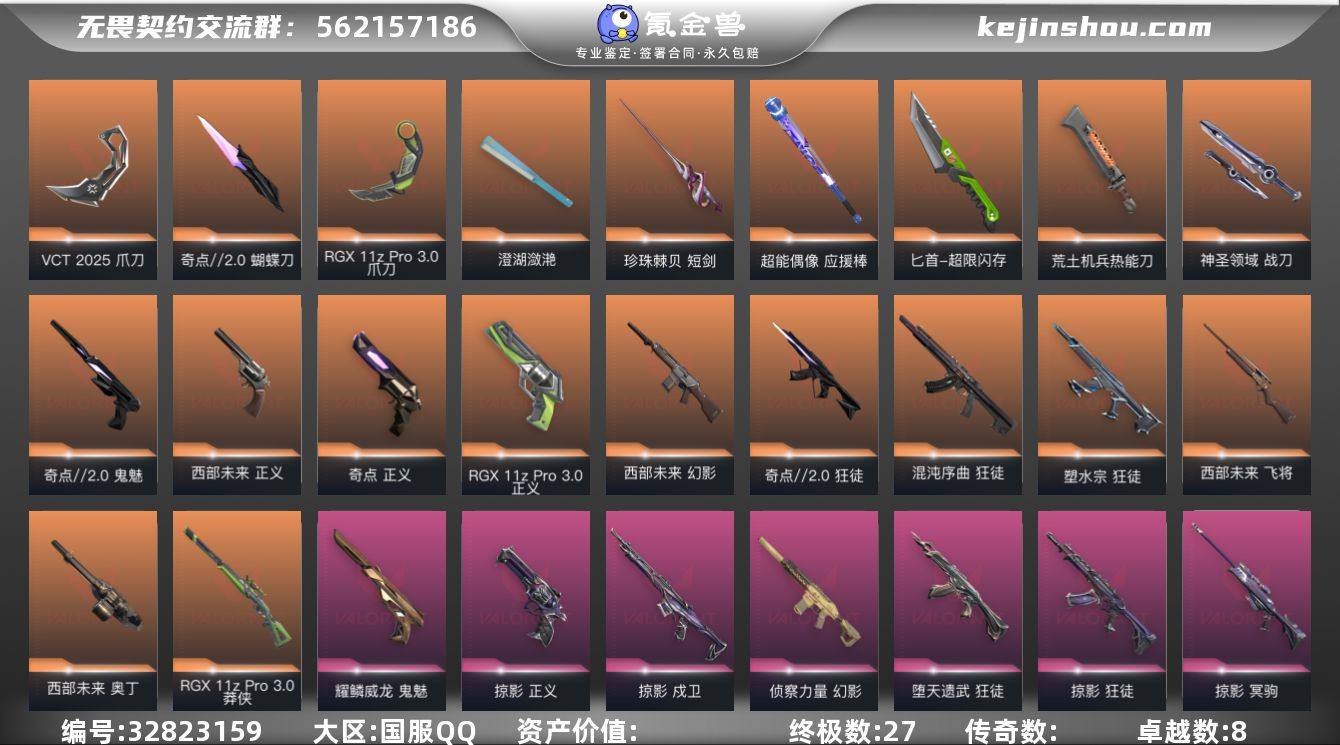 【NF189】【套装】:VCT 2025 赛季套装,西部未来套装,RGX 11z Pro//3.0套装,奇点//2.0套装,掠影套装 【英雄】:炼狱,维斯,暮蝶,钛狐,壹决,捷风,不死鸟,贤者,猎枭,芮娜,盖可 【近战武器】:近战武器-奇点//2.0 蝴蝶刀,近战武器-VCT 2025 爪刀,近战武器-紫金爪刀,近战武器-RGX 11z Pro//3.0 爪刀,近战武器-落英飞旋,近战武器-镭切,近战武器-澄湖潋滟,近战武器-鬼丸国纲,近战武器-未来开拓者,近战武器-珍珠棘贝 短剑,近战武器-超能偶像 应援棒,近战武器-超限闪存 匕首,近战武器-荒土机兵 热能刀,近战武器-圣石匕首,近战武器-影刃,近战武器-神圣领域 战刀 【狂徒】:狂徒-混沌序曲,狂徒-奇点//2.0,狂徒-塑水宗,狂徒-堕天遗武,狂徒-掠影,狂徒-超能偶像,狂徒-荒土机兵 【幻影】:幻影-西部未来,幻影-侦察力量,幻影-超限闪存,幻影-珍珠棘贝,幻影-神圣领域,幻影-聚合之力,幻影-纳米打击,幻影-西部未来 【戍卫】:戍卫-掠影,戍卫-超能偶像,戍卫-珍珠棘贝,戍卫-浮光跃金,戍卫-逆冲蛮牛,戍卫-战术熊与伙伴们,戍卫-月球哨兵 【獠犬】:獠犬-神圣领域,獠犬-采蜜小蜂队,獠犬-复古浪潮,獠犬-模拟赫兹,獠犬-逆冲蛮牛 【冥驹】:冥驹-冰点...