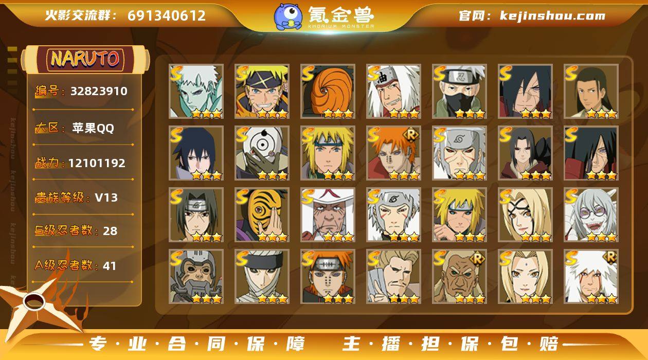 IOS/28S忍/41A忍/战力1210W/V13/区服403 【S忍者】 宇智波带土「十尾人柱力」,宇智波佐助「漩涡鸣人」,宇智波斑「五影会谈」 ,宇智波斑「秽土转生·解」,千手柱间「木叶创立」,宇智波佐助「永恒万花筒」,自来也「舞之豪杰」,旗木卡卡西「须佐能乎」,自来也「传说中的三忍」,宇智波鼬「秽土转生」,佩恩·天道「超」,药师兜「仙人模式」,宇智波斑「秽土转生」,艾「三代目雷影」,宇智波斑「白面具」,半藏「秽土转生」,千手扉间「秽土转生」,纲手「百豪」,波风水门「秽土转生」,无「二代目土影」,鬼灯幻月「二代目水影」,千手扉间,神秘面具男,宇智波鼬「须佐能乎」,佩恩「天道」,猿飞日斩,波风水门,纲手, 【A忍者】 机械鸣人「初始形态」,大野木「侠隐江湖」,巳月「仙人模式」,迈特凯「青春爆炸」,宇智波佐助「侠隐江湖」,长十郎「六代目水影」,漩涡博人「桃式显现」,宇智波鼬「夏日限定」,李洛克「忍界大战」,蝎「绯流琥」,宇智波泉奈,桃地再不斩「秽土转生」,角都「秽土转生」,波风水门「青年」,宇智波佐助「须佐能乎」,迪达拉「秽土转生」,照美冥「夏日泳装」,漩涡鸣人「九尾查克拉」,千代「近松十人卫」,药师兜「半蛇斗篷」,我爱罗「忍界大战」,小南「夏日泳装」,秋道丁次「...