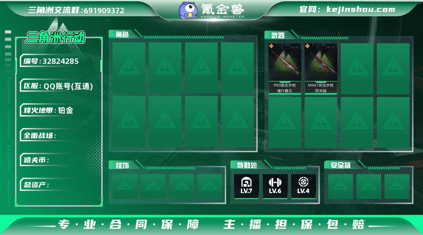 总资产:144.8M 9传说枪械 哈夫币:49.469K 可二次 可修改实名 【烽火地带段位】钻石 【全面战场段位】无段位 【传说武器皮肤】M4A1突击步枪-阿米娅,勇士冲锋枪-能天使-午夜邮差,SKS射手步枪-骑士,SG552突击步枪-运动员,R93狙击步枪-维什戴尔,SCAR-H战斗步枪-启航,G3战斗步枪-骑士,KC17突击步枪-电锯惊魂,M14射手步枪-蛮荒