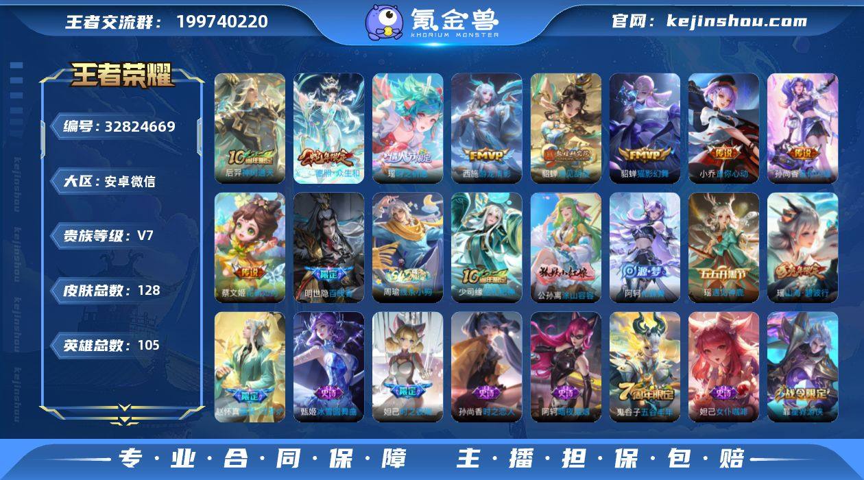 实名: 可修改 性别: 女号 贵族等级: V7 英雄数: 105 皮肤数: 128 传说皮: 猫影幻舞,音你心动-小乔,游龙清影,遇见胡旋,花朝如约,音你闪耀,神树通天 限定皮: 魔法小厨娘,时之彼端,时之祈愿-瑶,五谷丰年,神器·万象笔,山海·碧波行,愿照·众生和 亮点: 【优质装备】:猫影幻舞,音你心动-小乔,游龙清影(小青龙),遇见胡旋,花朝如约(花篮子),音你闪耀(rap皮),涂山容容