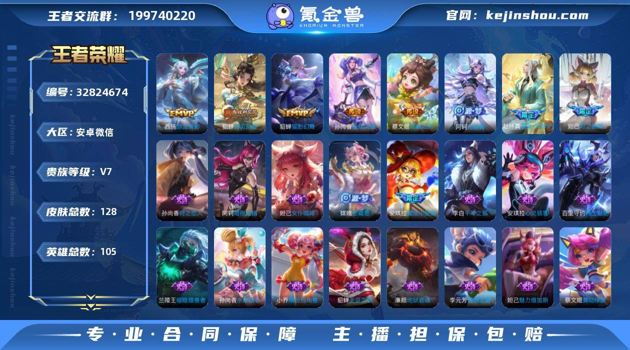 英雄 128皮肤 可修改实名 女号 【稀有英雄】大司命,韩信(韩跳跳),夏洛特(夏师傅),艾琳,橘右京(橘子),娜可露露(鸟人),不知火舞,金蝉(唐僧),戈娅 【传说皮】神树通天,遇见胡旋,游龙清影(小青龙),猫影幻舞,音你心动-小乔,花朝如约(花篮子),音你闪耀(rap皮) 【珍宝阁皮】万物之道,蔷薇恋人 【赛季/战令皮】古海寻踪(s33),星界游侠,海盐诗旅(s30),擒涛扼浪(s31),潮玩骑兵,奇幻香踪,探海日志(s32),玲珑珍味,天穹祈灯(s34),暖冬·兔眠,沙漠行僧(s26),幻夜卜梦,金庭之子(s27),大漠名商(s28),云中旅人(s29),超时空战士-钟无艳,落雪兰心 【史诗皮】百晓客,器灵·浮梦炉,化蝶舞,线条小狗-周瑜,巫礼祀神,涂山容容,遇见神鹿,特工魅影,千年之狐,匿光侦查者,高渐离燃音魔法,冰冠公主,暗夜猫娘,时之恋人-孙尚香,女仆咖啡,水果甜心,心灵骇客,暗隐猎兽者,舞动绿茵,地狱岩魂,诗语江南,拒霜思,缤纷独角兽,逐浪之夏,圣诞恋歌,魅力维加斯 【限定皮】愿照·众生和(妲己年限),时之彼端,魔法小厨娘,山海·碧波行(瑶年限),五谷丰年,时之祈愿-瑶(瑶传限),神器·万象笔 【普通皮】铁骨偃魂,雪境奇遇-西施,金福满堂,灵卦秘语,劲辣红锅,漠中幻影,玫蓝誓约,暗都幽影,浪漫序章,鹤鸣心笺,命运加冕,妄想特派,鬼谷子天...