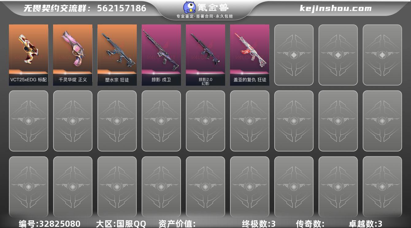 【英雄】:炼狱,维斯,暮蝶,壹决,捷风,幽影,不死鸟,贤者,猎枭,芮娜,奇乐,霓虹,K/O,盖可【狂徒】:狂徒-塑水宗,狂徒-盖亚的复仇【幻影】:幻影-掠影//2.0【戍卫】:戍卫-掠影【VCT手枪】:标配-VCT25 x EDG【正义】:正义-千灵华绽【狂怒】:狂怒-火线狂怒【卡面】:南瓜盛典 卡面,正义的化身 卡面,红鳞松叶 卡面,无畏契约GO!第一卷:芮娜 卡面,深海水族 卡面,无畏契约GO!第一卷:零 卡面,无垠星环 卡面,《双城之战》金克丝 卡面,钢锁vs盖可 卡面,代号红色 卡面,新兵报到 卡面,V契约 卡面,无畏契约 卡面【喷漆】:小丑猫 喷漆,买装还是存钱 喷漆,暴走萝莉 喷漆,胜利属于无畏契约 喷漆,GLHF 喷漆,无畏契约 喷漆【挂饰】:第九季//第三幕 纪念币 挂饰,无畏契约GO!第一卷 芮娜 挂饰,无畏契约GO!第一卷 零 挂饰,第九季//第二幕 纪念币 挂饰,VCT x EDG 挂饰,天外飞客 挂饰,无畏契约 纪念币 挂饰