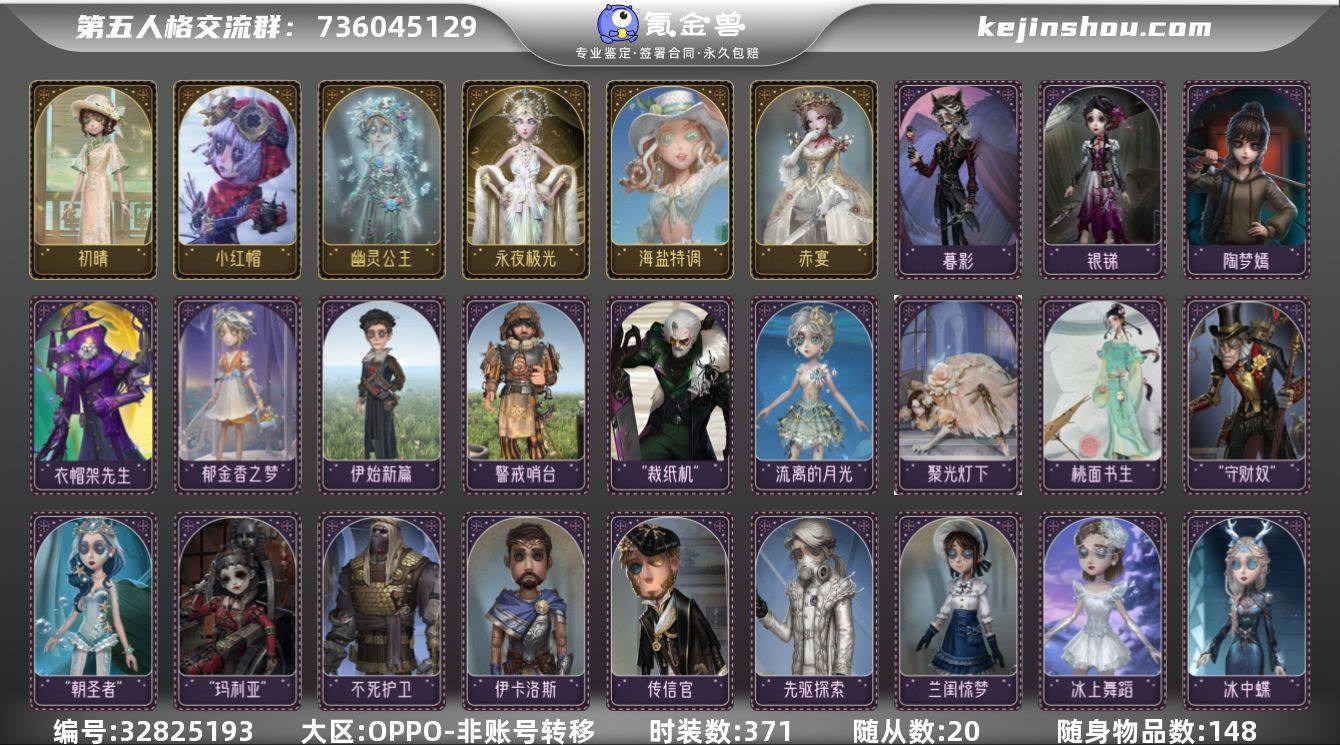 账号类型: 手机账号 时装数: 371 时装: 病患-玛吉努,“慈善家”-传信官,厂长-不死护卫,雕刻家-“玛利亚”,疯眼-“守财奴”,红蝶-罗生门,红蝶-永夜极光,红夫人-赤宴,画家-江户川乱步,“杰克”-绿纹大触,“杰克”-白纹大触,机械师-小红帽,祭司-梦之使者,祭司-“朝圣者”,祭司-冰中蝶,击球手-反骨之缚,空军-琼楼遗恨,空军-新岛真,昆虫学者-动植物学教授,鹿头-蒸汽朋克,魔术师-文学教授,冒险家-伊卡洛斯,盲女-甜心蛋糕,“囚徒”-电解,宿伞之魂-安魂曲,调香师-致命温柔,调香师-时之砂,调香师-冰上舞蹈,调酒师-黑玫瑰,调酒师-海盐特调,幸运儿-女仆装,先知-月相,先知-历战猎人,医生-往昔,医生-采药人,园丁-兰闺惊梦,园丁-罗刹绯春,园丁-真相小姐,园丁-幽灵公主,园丁-等风来,佣兵-白鹰之舞,野人-弄臣,“噩梦”-圣洁,古董商-黑鸦,幸运儿-星航之旅,园丁- 初晴,作曲家-先驱探索,机械师-纸心,昆虫学者-菲丽丝,宿伞之魂-桃面书生,蜘蛛-聚光灯下,舞女-流离的月光,“博士”-“裁纸机”,飞行家-警戒哨台,小说家-“伊始新篇”,园丁-郁金香之梦,黄衣之主-衣帽架先生,古董商-陶梦嫣,医生-银锑 ,园丁-源自星辰,病患-休塔尔克,作曲家-暮影