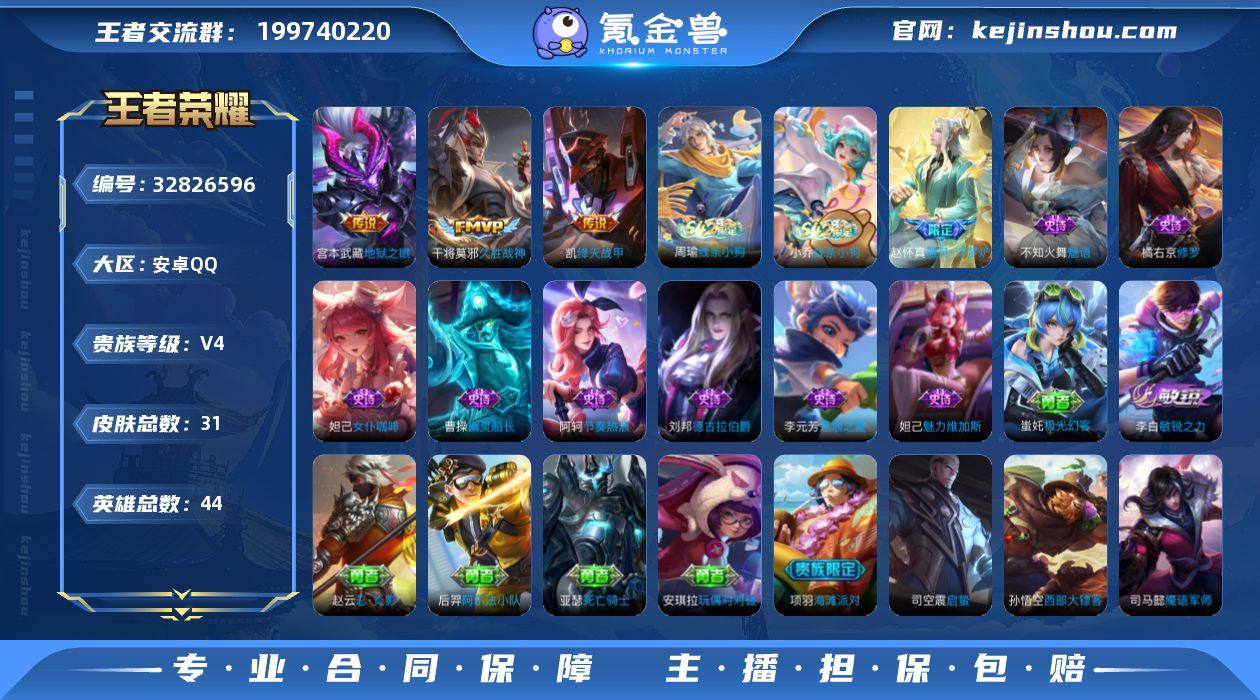 安卓Q-V4-至尊星耀IV段位-44英雄-31皮肤-4传说-13史诗【传说皮肤】:马超神骥逐星野,铠绛天战甲,干将莫邪久胜战神,宫本武藏地狱之眼【限定皮肤】:项羽海滩派对【战令限定】:周瑜线条小狗,小乔线条小狗【史诗皮肤】:达摩星君亢金,上官婉儿春霖将至,明世隐百晓客,周瑜线条小狗,小乔线条小狗,赵怀真器灵浮梦炉,橘右京修罗,不知火舞魅语,阿轲节奏热浪,李元芳逐浪之夏,刘邦德古拉伯爵,曹操幽灵船长,妲己女仆咖啡,妲己魅力维加斯【其他皮肤】:影百相守梦,蚩奼极光幻客,李白敏锐之力,后羿阿尔法小队,亚瑟死亡骑士,安琪拉玩偶对对碰,赵云忍炎影,项羽海滩派对,司空震启蛰,镜冰刃幻境,司马懿魇语军师,孙悟空西部大镖客,鲁班七号福禄兄弟【营地ID】:1548552707