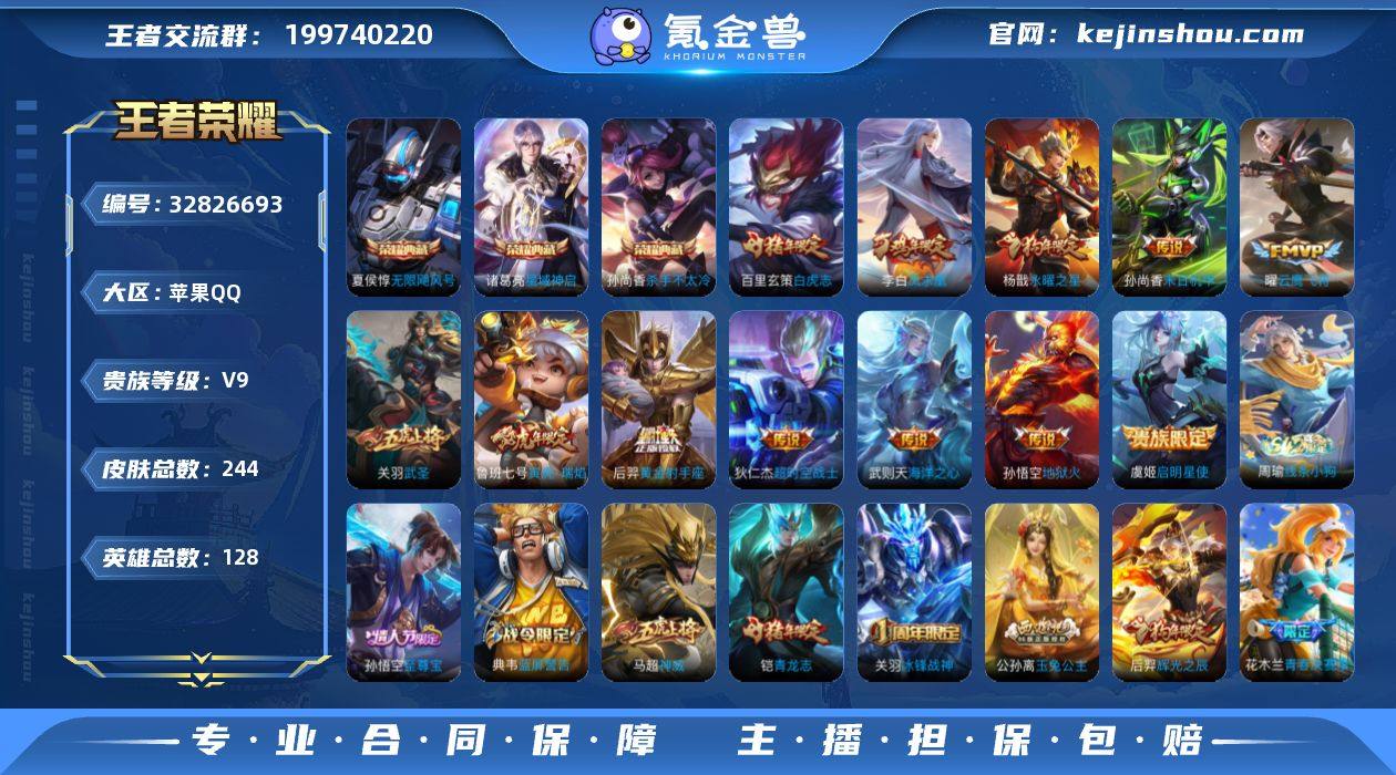 苹果Q-V9-至尊星耀V段位-128英雄-244皮肤-3典藏皮肤-1典藏英雄-12传说-63史诗【荣耀典藏】:武则天英雄,夏侯惇无限飓风号,孙尚香杀手不太冷,诸葛亮星域神启【传说皮肤】:鲁班七号寅虎瑞焰,虞姬启明星使,关羽武圣,曜云鹰飞将,百里玄策白虎志,后羿黄金射手座,杨戬永曜之星,李白凤求凰,孙尚香末日机甲,孙悟空地狱火,武则天海洋之心,狄仁杰超时空战士【限定皮肤】:白起狰,狄仁杰阴阳师,虞姬凯尔特女王,赵云皇家上将,赵云百木心枪,嬴政白昼王子,孙尚香蔷薇恋人,鲁班七号狮舞东方,鲁班七号寅虎瑞焰,阿轲迷踪丽影,孙膑妖精王,扁鹊炼金王,芈月重明,芈月幻夜卜梦,吕布猎兽之王,周瑜赤莲之焰,元歌云间偶戏,夏侯惇朔风刀,甄姬游园惊梦,曹操烛龙,典韦穷奇,典韦蓝屏警告,狄仁杰魔术师,狄仁杰万华元夜,达摩沙漠行僧,项羽海滩派对,项羽霸王别姬,老夫子醍醐杖,关羽冰锋战神,关羽武圣,程咬金演武夺筹,刘邦夺宝奇兵,韩信逐梦之影,韩信飞衡,兰陵王驯魔猎人,花木兰青春决赛季,亚瑟潮玩骑士王,孙悟空美猴王,孙悟空至尊宝,牛魔御旌,后羿辉光之辰,虞姬霸王别姬,虞姬启明星使,钟馗神迹守卫,钟馗驱傩正仪,杨玉环遇见飞天,杨玉环寅虎心曲...