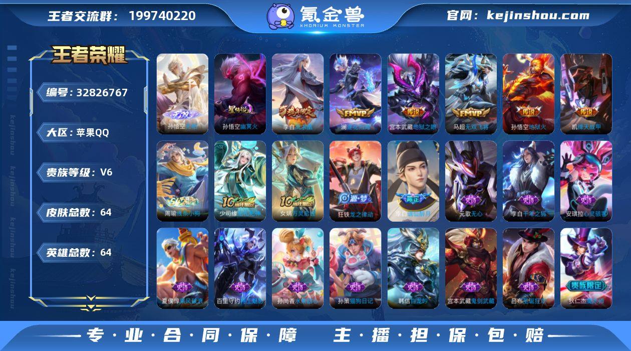 苹果Q-V6-最强王者段位-64英雄-64皮肤-1无双-8传说-21史诗【英雄全皮】:孙权全皮【无双皮肤】:孙悟空无相【传说皮肤】:韩信踏浪归,云缨神骥越千峰,澜逐花归海,马超无双飞将,铠绛天战甲,李白凤求凰,宫本武藏地狱之眼,孙悟空地狱火【限定皮肤】:李白谪仙醉月,狄仁杰阴阳师,赵云皇家上将,元歌无心,狄仁杰魔术师,项羽海滩派对【年限皮肤】:李白凤求凰【赛季限定】:甄姬逆浪荇歌,亚瑟荣光之誓【战令限定】:周瑜线条小狗【史诗皮肤】:达摩星君亢金,盘古撼世英歌,周瑜线条小狗,少司缘巫礼祀神,女娲万灵启世,狂铁龙之律动,李白谪仙醉月,元歌无心,孙策猫狗日记,李元芳逐浪之夏,百里守约特工魅影,安琪拉心灵骇客,夏侯惇乘风破浪,韩信白龙吟,张飞乱世虎臣,李白千年之狐,吕布圣诞狂欢,孙尚香水果甜心,宫本武藏鬼剑武藏,狄仁杰魔术师,貂蝉圣诞恋歌,赵云皇家上将【其他皮肤】:影百相守梦,妲己线条小狗,蒙恬苍云破阵,安琪拉糖果风暴,虞姬溯影追猎,蚩奼极光幻客,艾琳鹤鸣心笺,孙权径山谋武,亚瑟荣光之誓,甄姬逆浪荇歌,妲己紫罗兰之誓,盘古重装意志,孙尚香沉稳之力,刘备汉昭烈帝,刘备纽约教父,狄仁杰阴阳师,后羿阿尔法小队,甄姬花...