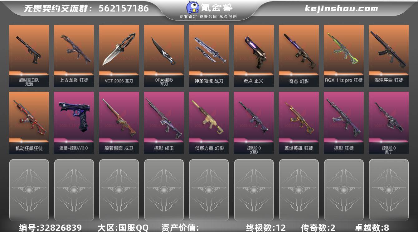 【套装】:VCT 2026 赛季套装,回火礼包:掠影套装,掠影//3.0套装【英雄】:幻棱,炼狱,维斯,暮蝶,钛狐,壹决,铁臂,捷风,雷兹,幽影,不死鸟,贤者,猎枭,蝰蛇,零,芮娜,奇乐,尚勃勒,霓虹,斯凯,夜露,星礈,K/O,海神,盖可,黑梦,钢锁【近战武器】:近战武器-碎心裂刃,近战武器-VCT 2026 篆刀,近战武器-影蝶,近战武器-ORA x 颗秒 军刀,近战武器-镭切,近战武器-神圣领域 战刀【狂徒】:狂徒-混沌序曲,狂徒-机动狂飙,狂徒-RGX 11z Pro,狂徒-上古龙炎,狂徒-掠影,狂徒-盖世英雄【幻影】:幻影-奇点,幻影-侦察力量,幻影-掠影//2.0,幻影-神圣领域【戍卫】:戍卫-般若假面,戍卫-掠影,戍卫-月球哨兵【獠犬】:獠犬-神圣领域【冥驹】:冥驹-星云暗涌【莽侠】:莽侠-月球哨兵【战神】:战神-神圣领域【奥丁】:奥丁-掠影//2.0【雄鹿】:雄鹿-月球哨兵【骇灵】:骇灵-星云暗涌【蜂刺】:蜂刺-星云暗涌【追猎】:追猎-掠影//3.0【正义】:正义-奇点,正义-月球哨兵【鬼魅】:鬼魅-超时空卫队,鬼魅-诡秘蛇影,鬼魅-星云暗涌【狂怒】:狂怒-神圣领域【卡面】:《双城之战》拥抱 卡面,精灵大战 卡面,欢迎来到底城 卡面,南瓜盛典 卡面,VCT CN首冠 卡面,...