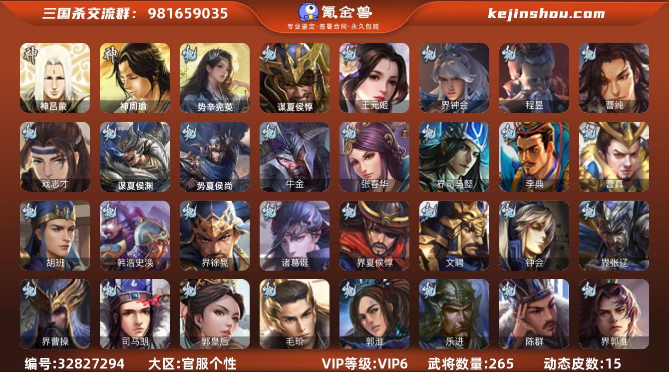VIP等级: VIP6 官阶: 骠骑将军 武将数量: 265 动态皮肤数量: 15 神将: 神吕蒙,神周瑜 魏国武将: 戏志才,曹纯,程昱,界钟会,王元姬,SP蔡文姬,SP曹仁,SP关羽,SP姜维,蔡贞姬,曹昂,曹冲,曹叡,张恭,鲁芝,界满宠,界曹植,满宠,王基,钟繇,蒯越蒯良,阮慧,杜畿,界郭嘉,崔琰,界曹丕,界荀彧,朱灵,界甄姬,吕虔,界王异,界许褚,界郭淮,陈群,乐进,郭淮,毛玠,郭皇后,司马朗,界曹操,界张辽,钟会,文聘,界夏侯惇,诸葛诞,界徐晃,韩浩史涣,胡班,曹真,李典,界司马懿,张春华,牛金,谋夏侯惇,势夏侯尚,谋夏侯渊,势辛宪英 蜀国武将: 花鬘,沙摩柯,谋马超,吕凯,界关羽,邓芝,界伊籍,费祎,严颜,界张嶷,张松,彭羕,界刘备,刘封,糜竺,谋庞统,吴懿,黄皓,界法正,糜夫人,界孟获,谋诸葛亮,关银屏,界祝融,SP孙尚香,SP徐庶,周仓,简雍,界关兴张苞,界张飞,界简雍,赵统赵广,界马岱,关平,诸葛果,谋张飞,廖化,关兴张苞,界马超,夏侯霸,李严,马良,甘夫人 吴国武将: 界徐盛,界朱然,潘濬,张温,全琮,谋周瑜,界全琮,蒋钦,顾雍,阚泽,界朱治,界孙权,界凌统,界吕蒙,凌操,朱治,程普,韩当,诸葛瑾,朱然,吕范,虞翻,界孙坚,界黄盖,孙鲁班,界周瑜,卫温诸葛直,谋小乔,鲁肃,界甘宁,界韩当,界大乔,孙鲁育,潘璋马忠,界陆逊,朱桓 群国武将: 界李儒...
