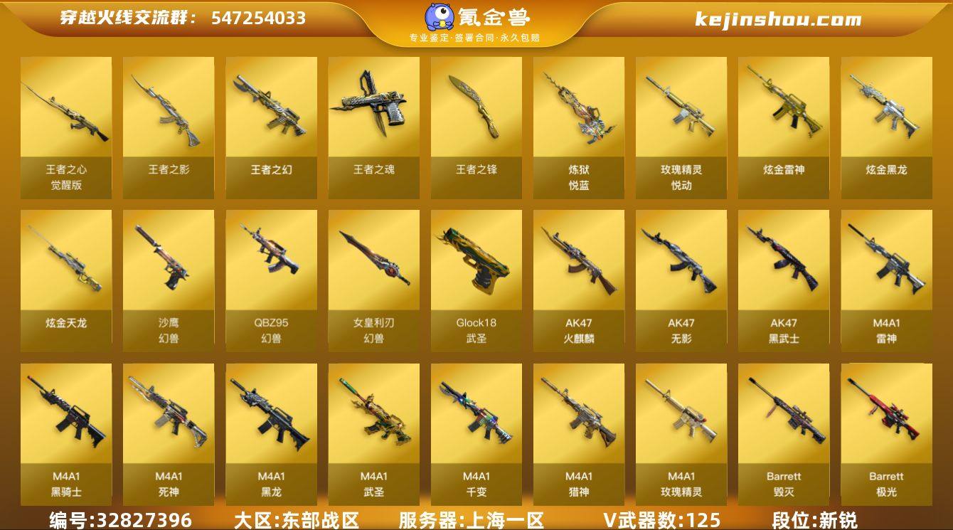 【ky5044】上海一区-131V-7王者武器数-3炫金武器数 【热门武器】:QBZ03-金色蔷薇*8,死亡之眼,M4A1-黑骑士,汤姆逊-烈龙*9,RPK-盘龙*6,沙鹰-修罗*12,高爆手雷-幻兽*5 【王者炫金武器】:王者之幻,玫瑰精灵-悦动,王者之影,炼狱-悦蓝,王者之魂,王者之锋,炫金黑龙,炫金雷神,炫金天龙 【音效卡】:M4A1-雷神音效卡,Barrett-毁灭音效卡 【皮肤】:雷神-暗月,雷神-能量核心*2,雷神-荣耀之魄,雷神-星空,雷神-神秘按键 皮肤,火麒麟-大唐荣光,毁灭-暗月*3,毁灭-荣耀之怒,毁灭-英雄计划 皮肤,黑骑士-暗月*2,无影-暗月*2,死神-秘银*3,天启-暗月,天龙-秘银,天龙-能量核心,极光-能量核心,修罗-能量核心*2,修罗耀金皮肤,天神-暗月*3,屠龙-荣耀之锋 【角色】:零,葵,樱,蝴蝶,魅影,王者-零,堕落女神,暗夜-X,初恋灵狐,嘉年华灵狐,娟娟,潘多拉-X,潘多拉-甜心教官,铁骑荣耀,雪莉杨 【人偶武器】:COP-旗袍,M4A1-刀锋 【暴走生化】:死亡之眼,超级对讲机 【英雄级武器】:M4A1-千变,AK47-火麒麟*7,M4A1-黑龙,M4A1-雷神*5,M4A1-黑骑士,AK47-无影*8,M4A1-死神*2,AK47-黑武士,M4A1-武圣,M4A1-玫瑰精灵,QBZ95-幻兽,QBZ03-金色蔷薇*8,M4A...