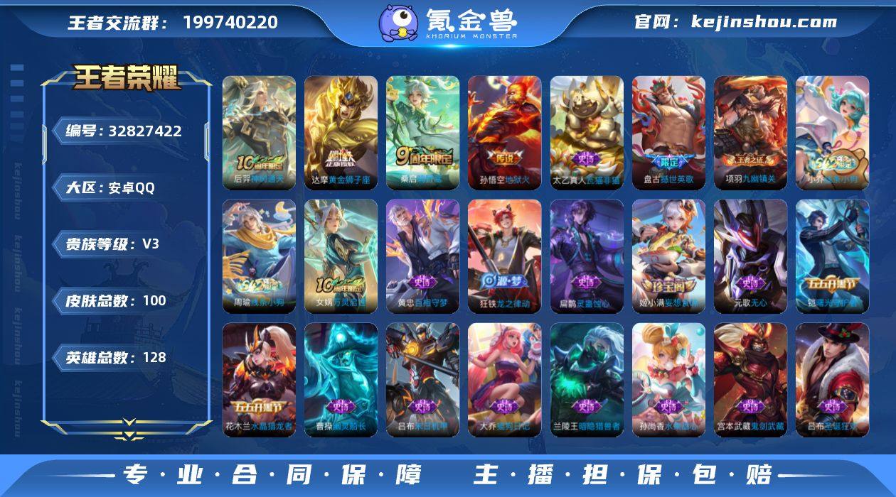 安卓Q-V3-最强王者段位-128英雄-100皮肤-4传说-24史诗 【英雄全皮】:孙权全皮,敖隐全皮,空空儿全皮 【传说皮肤】:后羿神树通天,桑启鸣野蒿,达摩黄金狮子座,孙悟空地狱火 【限定皮肤】:蒙犽顽岩魄,姜子牙天穹之誓,狄仁杰阴阳师,元歌无心,裴擒虎擒涛扼浪,鲁班大师探海日志,桑启海盐诗旅,鬼谷子天穹祈灯,姬小满妄想食味,沈梦溪龙舞盛年 【赛季限定】:桑启海盐诗旅,裴擒虎擒涛扼浪,鲁班大师探海日志,鬼谷子天穹祈灯,姜子牙天穹之誓,东皇太一噬灭天穹,太乙真人谧流熔炉,甄姬逆浪荇歌,亚瑟荣光之誓,项羽九幽镇关 【战令限定】:周瑜线条小狗,小乔线条小狗 【史诗皮肤】:太乙真人瓦猫非猫,盘古撼世英歌,周瑜线条小狗,小乔线条小狗,项羽九幽镇关,女娲万灵启世,黄忠百相守梦,扁鹊灵蛊蚀心,狂铁龙之律动,蒙犽顽岩魄,姬小满妄想食味,元歌无心,百里玄策热力回旋,大乔猫狗日记,铠曙光守护者,兰陵王暗隐猎兽者,花木兰水晶猎龙者,张飞乱世虎臣,吕布末日机甲,曹操幽灵船长,吕布圣诞狂欢,妲己魅力维加斯,孙尚香水果甜心,宫本武藏鬼剑武藏,廉颇地狱岩魂 【其他皮肤】:影百相守梦,桑启线条小狗,虞姬溯影追猎,艾琳鹤鸣心笺,孙权径山谋...
