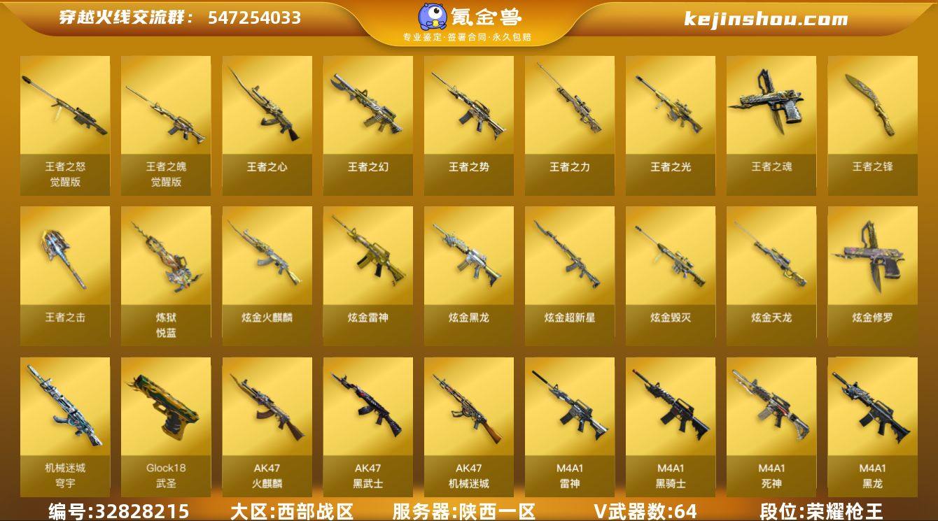 【ky6472】陕西一区-69V-13王者武器数-12炫金武器数 【热门武器】:QBZ03-金色蔷薇,死亡之眼,M4A1-黑骑士,汤姆逊-烈龙*2,RPK-盘龙,沙鹰-修罗*2 【王者炫金武器】:王者之幻,王者之势,王者之心,王者之光*2,王者之力,炼狱-悦蓝*2,王者之魂,王者之击,王者之锋,炫金火麒麟,炫金黑龙,炫金雷神,炫金超新星*6,炫金毁灭,炫金天龙,炫金修罗 【音效卡】:M4A1-雷神音效卡,M4A1-黑骑士音效卡,Barrett-毁灭音效卡 【皮肤】:裁决-星际旅行 皮肤,雷神-暗月,雷神-R.LGD-CFPLS18冠军,雷神-宇航兔皮肤,火麒麟-AG战队皮肤,火麒麟-百城,毁灭-暗月*2,毁灭-星空,毁灭-英雄计划 皮肤,黑骑士-暗月,无影-暗月*2,死神-秘银*2,天启-暗月*2,天龙-能量核心,极光-能量核心,修罗-能量核心,天神-暗月,龙啸-黯钢战甲 皮肤 【角色】:零,魅影,炫,王者-零,狐影,乔伊教练,修道士,暗夜-X,零-水下丽影,灵狐者-黄金海岸,灵狐者-七夕宝贝,麻雀,潘多拉-X,潘多拉-甜心教官,兔囡囡,影武者-X,团团 【人偶武器】:天龙-曼陀罗,M4A1-雷神-精英刀锋,COP-旗袍,迷你裂空之翼 【暴走生化】:死亡之眼,超级对讲机 【挑战大师】:AK47-冰龙粉碎者,激光毁灭者III 【...