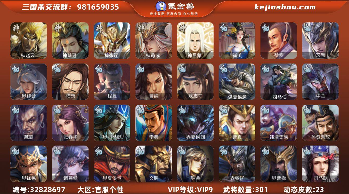 【14789856】官阶:骠骑将军;VIP等级:VIP9;史诗武将数量:28;动态皮肤数量:23;武将总数:301;史诗宝珠数量:0;将魂数量:352;神将:4;魏国史诗武将:8;蜀国史诗武将:5;吴国史诗武将:4;群史诗武将:8