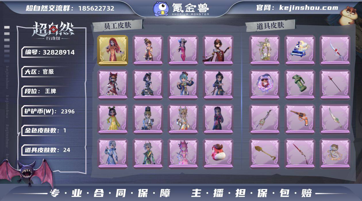 金皮1;紫皮14;道具皮24;皮肤:巫铃儿-镜花辞,阿念-庆宴绮愿,爱丽丝-丝缕哀歌,逍遥-绣春逍影,莉莉-情公主,阿念-灵昭鹿鸣,莉莉-莓果陷阱,小黄-呱呱雨衣,小黄-异色序曲,阿念-迷途僵宝,阿念-王子与骑士,逍遥-泽引山海,薇薇安-仙锋小姐,爱丽丝-耀眼的你,零-青云逸歌;道具:长枪-罪棘,额外的背包-飞花令,夜视仪-金丝眼镜,音响-happy猫,黄牛能量饮料-青玉抱丹,音响-咏叹调,刺刀-铂刺与红萼,腰包-宝剑八,短管猎枪-星光的裁决,铲子-龙鳞,闪光弹-金戈玄铜,桃木剑-凤鸣九天,专业手电-花束般的告白,转轮手枪-新星时代,刺刀-碧络琅环,折扇-露露扇,音响-月光奏鸣曲,急救包-蔷薇物语,喷气背包-乘风溯雪,长鞭-小狗蛇点点鞭,音响-鸣沙鼓,夜视仪-心跳眼镜,除颤仪-弦外之音,伞-伞;美妆:美妆-天使之泪,美妆-暗夜小恶魔;饰品:头饰-马上有钱,头饰-精致露比头套,头饰-雪墩墩头套,头饰-滑稽头套,头饰-炙热烧烤,头饰-哈士奇头套,头饰-呆滞头套,头饰-面具马头套,头饰-惊魂南瓜头套,头饰-嘻嘻头套,头饰-饺饺者头套,头饰-蒜了八,头饰-烛光纪念,头饰-腊肠扭扭,头饰-咬咬鲨头套,头饰-太空鲨头套,头饰-卑微头套,头饰-火爆了头套,头饰-烈焰红唇头套,头饰-大葱明头套,头饰-樱桃奶油布丁,头饰-萨卡班甲鱼...