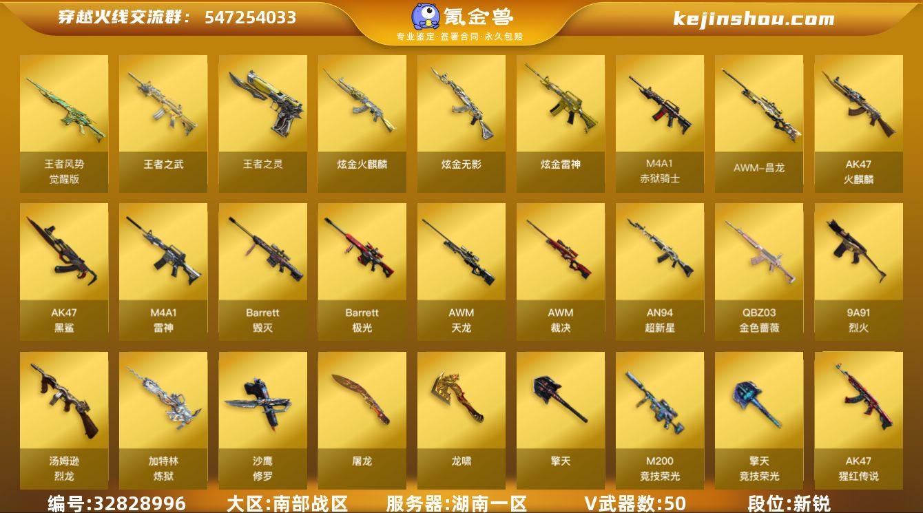 【ky6356】湖南一区-54V-3王者武器数-3炫金武器数 【热门武器】:QBZ03-金色蔷薇,M200-竞技荣光,汤姆逊-烈龙*6,加特林-炼狱*3,沙鹰-修罗*2 【王者炫金武器】:王者之武,王者之灵,炫金火麒麟,炫金无影,炫金雷神 【音效卡】:Barrett-毁灭音效卡,AWM-昌龙-怀旧音效卡 【皮肤】:QBZ03-AG-CFPLS19冠军,雷神-星空,雷神-神秘按键 皮肤,火麒麟-雷神,毁灭耀金皮肤,毁灭-英雄计划 皮肤,天龙-能量核心,炼狱-星空,炼狱-月 皮肤,修罗-能量核心 【角色】:葵,零·纪元,战地猎狐,王者-零,乔伊教练,幻面灵狐,风暴女,嘉年华灵狐,兰-海滩派对,龙儿,麻雀,潘多拉-甜心教官,蜀雪,雪莉杨-摸金校尉 【人偶武器】:M4A1-雷神-精英刀锋,AWM-灵狐-15周年嘉年华 【挑战大师】:冰龙粉碎者-白马银枪,阐释者III 【英雄级武器】:AK47-火麒麟,M4A1-雷神*3,AN94-超新星,AK47-黑鲨,QBZ03-金色蔷薇,9A91-烈火,AK-47-猩红传说,王者风势-觉醒版,AWM-天龙,Barrett-毁灭*2,Barrett-极光,AWM-裁决,M200-竞技荣光,加特林-炼狱*3,汤姆逊-烈龙*6,沙鹰-修罗*2,屠龙*4,龙啸,擎天,擎天-竞技荣光,屠龙-电竞之星,龙啸-烈火龙威,高爆手雷-竞技荣光*5,闪光弹-竞技荣...