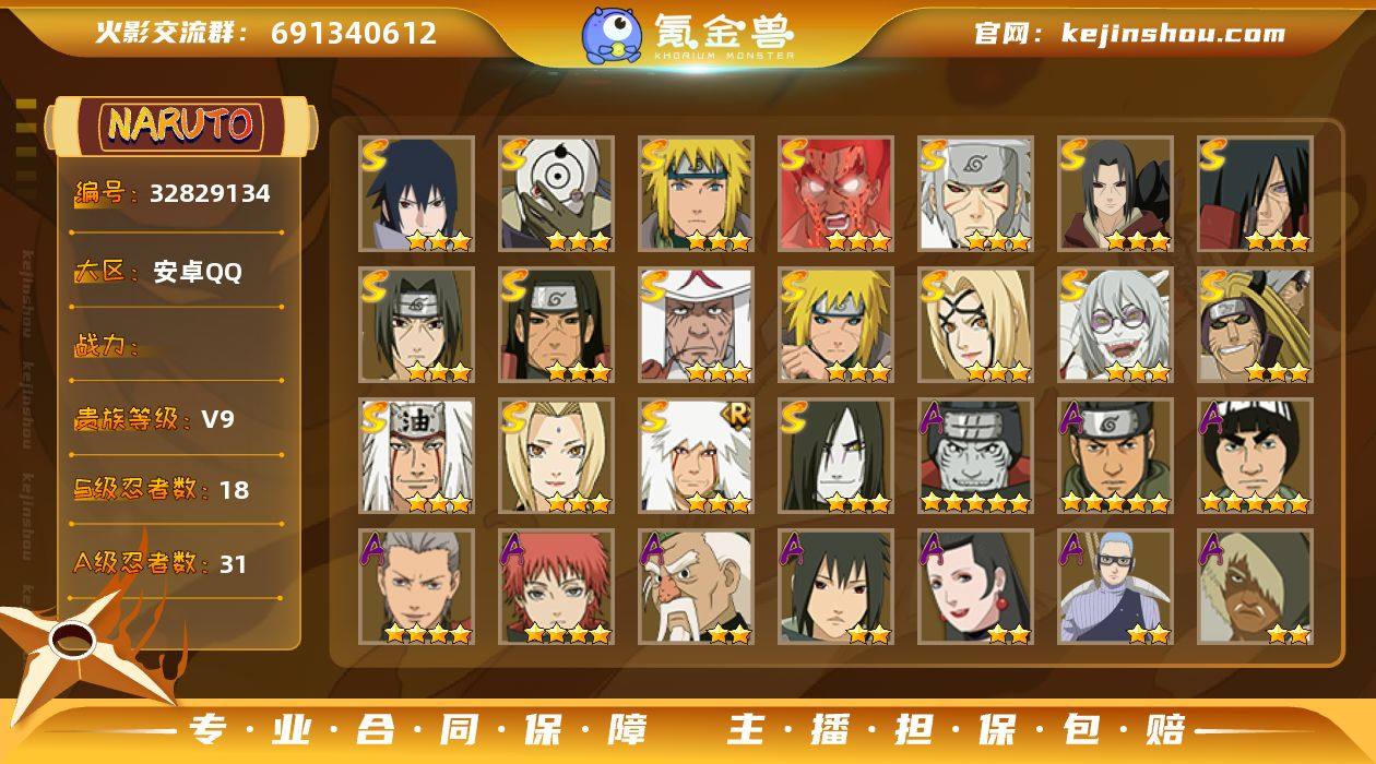【编号42419 可秒换绑】【店长推荐!极品小号!带有白面具和秽土鼬等强度高热门的s忍,再是漂泊武士再不斩,还有普通人长十郎,再是仙人模式自来也即将抽出!】 18S级忍者数-31A级忍者数 【S级忍者】:金角·银角「秽土转生」(3星),波风水门「秽土转生」(3星),千手扉间「秽土转生」(3星),千手柱间「秽土转生」(3星),宇智波鼬「秽土转生」(3星),宇智波斑「秽土转生」(3星),宇智波鼬「须佐能乎」(3星),自来也(3星),自来也「舞之豪杰」(3星),大蛇丸(3星),纲手(3星),纲手「百豪」(3星),猿飞日斩(3星),波风水门(3星),药师兜「仙人模式」(3星),迈特凯「死门」(3星),宇智波佐助「永恒万花筒」(3星),宇智波斑 「白面具」(3星宇智波斑「白面具」) 【A级忍者】:波风水门「青年」(2星),达鲁伊「博人传」(2星),迪达拉「秽土转生」(2星),大蛇丸「晓」(2星),奇拉比「忍界大战」(2星),飞段(4星),飞段「死司凭血」(2星),干柿鬼鲛(5星),漩涡鸣人「仙人模式」(2星),漩涡鸣人「九尾查克拉」(2星),迈特凯(5星),旗木卡卡西「万花筒写轮眼」(2星),桃地再不斩「漂泊武士」(2星),我爱罗「疾风传」(2星),我爱罗「忍界大战」(2星),蝎(4星),小南(2星),角都(2星),猿飞...