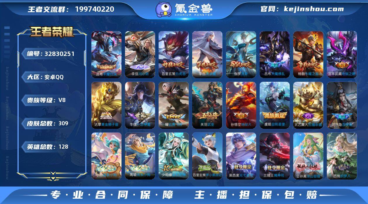 注:该账号为连体号,详细信息如下 王者荣耀:309个皮肤(12个传说皮,一个无双,一个典藏)。 联盟手游(315个皮肤):45个传说皮肤(一个年限永恩)2个神话,201个史诗皮肤。 金铲铲:四个小小英雄,一个竞技场皮肤。 穿越火线:45把金V武器,15把源武器