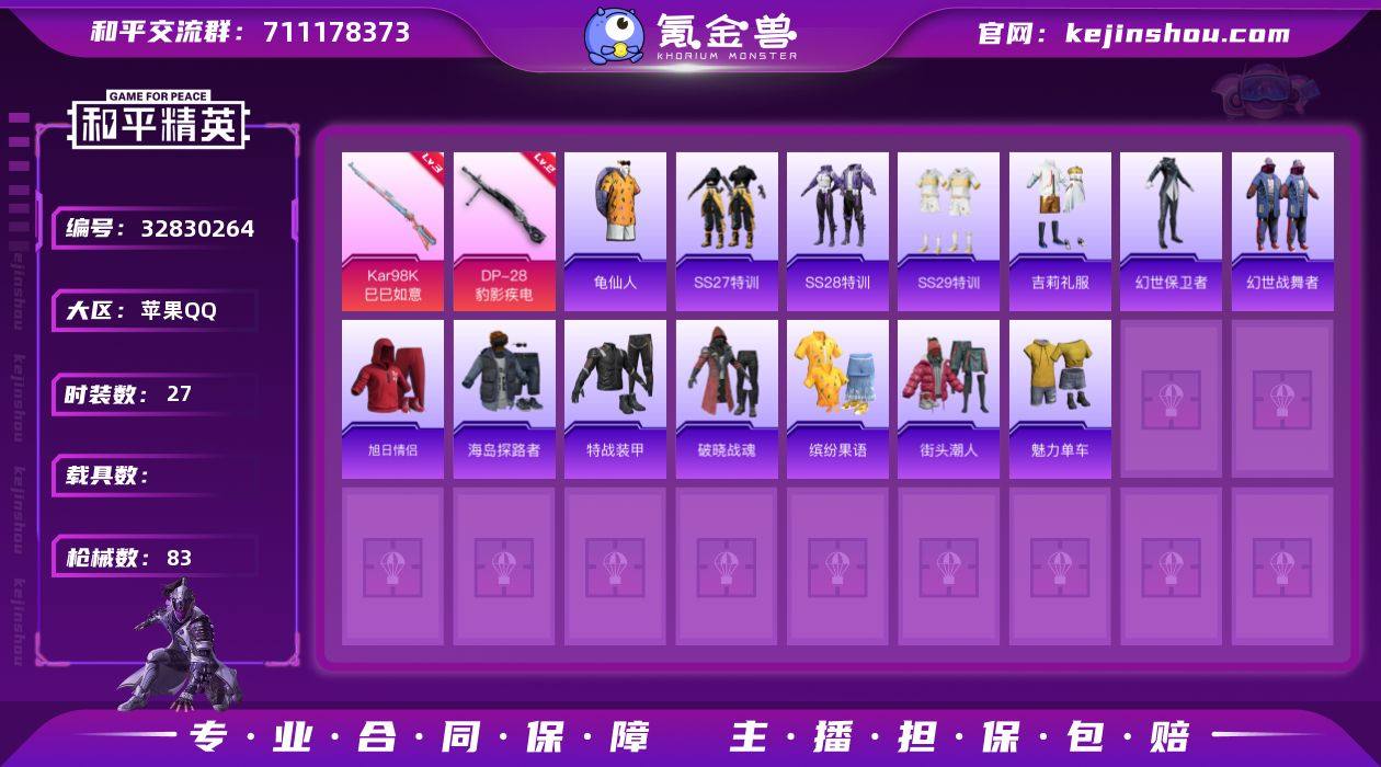 苹果 手Q-0粉装-3特效枪-0载具-1粉色飞行器-16004热力值-1王牌印记-27套装-83枪皮 【热门品类】:套装-龟仙人 【粉色枪皮等级】:Kar98K-巳巳如意(三级),Mk14-福马献瑞(一级),DP-28-豹影疾电(二级) 【粉色枪皮】:Kar98K-巳巳如意,Mk14-福马献瑞,DP-28-豹影疾电 【粉色飞行器】:炫彩糖果飞行器 【粉色降落伞】:圣堂之誓降落伞,月影灵韵降落伞,荧海星豚降落伞,极意拳锋降落伞,炫彩糖果降落伞 【稀有套装】:套装-龟仙人,套装-雪国风尚,套装-炫彩糖果,套装-迅捷龙虾 【稀有枪皮】:AUG-冰晶雪宝,AKM-破晓战魂,M16A4-幻世战舞者,M16A4-红色方程式,M16A4-蓝色火焰,SCAR-L-夜灯,SCAR-L-炫彩节奏,SCAR-L-玉兔迎春,SCAR-L-红色方程式,M416-红色方程式,M416-蓝色火焰,AUG-天降萌叽,AUG-耀粉歌者,M762-天降萌叽,AC-VAL-天降萌叽,蜜獾-天降萌叽,UZI-天降萌叽,UZI-影袭,UZI-红色方程式,UMP45-夜灯,UMP45-生命誓言,UMP45-蓝色火焰,汤姆逊-天降萌叽,汤姆逊-耀粉歌者,P90-巳巳如意,Kar98K-彩虹符号,Kar98K-影袭,Kar98K-红色方程式,SKS-炫彩节奏,Mini14-炫彩节奏,Mini14-耀粉歌者,S686-红色方程式,S12K-破晓战魂,S12K-夜灯,M249-彩虹符号,M2...