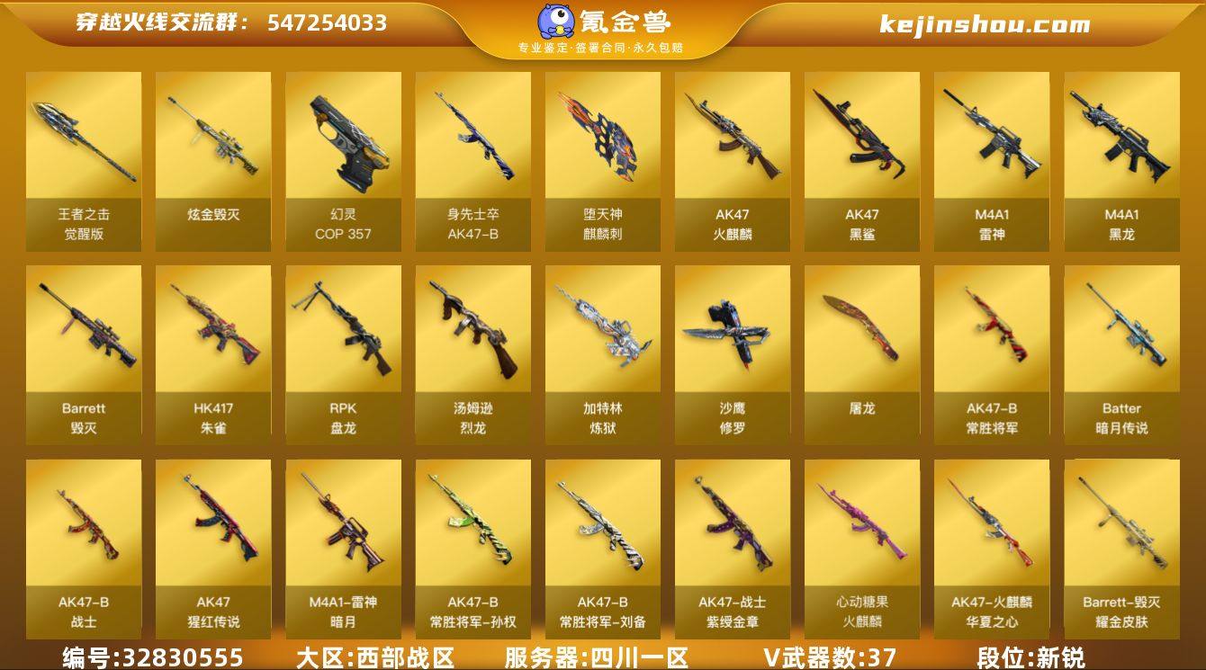 四川一区-41V-2王者武器数-1炫金武器数 【热门武器】:HK417-朱雀,死亡之眼,汤姆逊-烈龙*6,RPK-盘龙*6,加特林-炼狱*4,COP 357-幻灵,沙鹰-修罗 【王者炫金武器】:炫金毁灭 【音效卡】:M4A1-雷神音效卡 【皮肤】:雷神-暗月,火麒麟-华夏之心,火麒麟-心动糖果,毁灭耀金皮肤,战神-紫绶金章皮肤*2,AK47-B-常胜将军-刘备,AK47-B-常胜将军-孙权*2 【角色】:葵,审判者,王者-瞳-闭月羞花,风暴女*2,娟娟,灵狐者-X,潘多拉-X,青霞仙子,斯沃特-X,影武者-X 【人偶武器】:迷你牛牛,迷你生化手雷,闪光弹-小乔,闪光弹-貂蝉,高爆手雷-大乔,迷你艾比 【暴走生化】:死亡之眼,超级对讲机 【挑战大师】:神圣爆裂者-末日III 【英雄级武器】:AK47-火麒麟*2,M4A1-黑龙,M4A1-雷神,AK47-黑鲨,HK417-朱雀,AK-47-猩红传说,AK47-B-常胜将军,AK47-B-身先士卒,AK47-B-战士,Barrett-毁灭,Barrett-暗月传说,RPK-盘龙*6,加特林-炼狱*4,汤姆逊-烈龙*6,沙鹰-修罗,COP 357-幻灵,屠龙*2,麒麟刺-堕天神,王者之击-觉醒版*2,高爆手雷-堕天神,高爆手雷-幻灵,闪光弹-堕天神,烟雾弹-堕天神 【其他武器】:源-千变,魂·火麒麟-百城,御·火麒麟-平天大圣,源-黑龙,...
