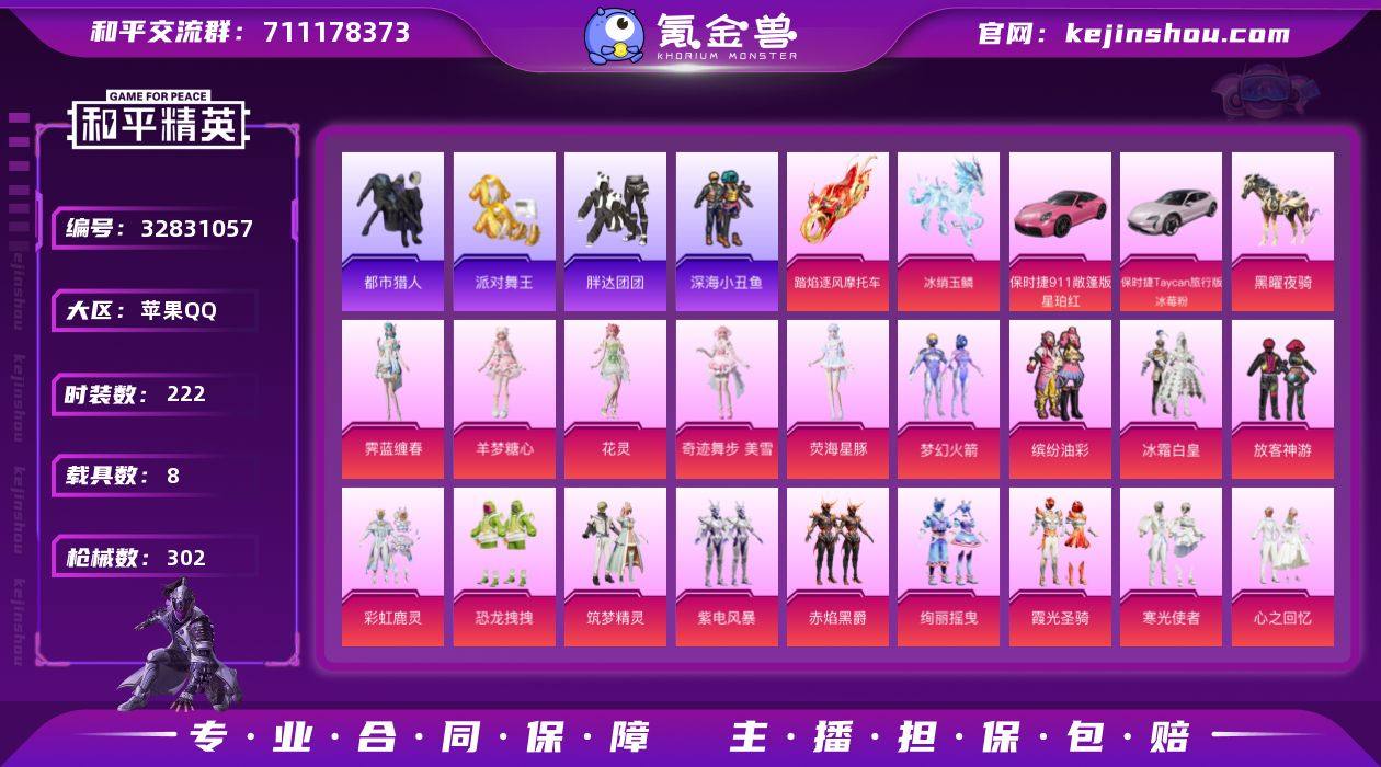 【AUG星梦奇缘金鞋都市男神小番茄LED眼罩红眼罩小熊背包 8载具22粉装22特效枪身法素材号 秒换绑不用等】 苹果Q区-116000热力值-222套装-302枪皮 【8载具】 路特斯EL蓝色 路特斯EV黄色 玛莎拉蒂Q蓝色 黑曜夜骑 冰绡玉鳞 踏焰逐风摩托车 保时捷Taycan 旅行版(冰莓粉) 保时捷911 敞篷版(星珀红)【8稀有】 都市猎人 派对舞王(金靴子) 萌熊伴侣背包(小熊背包) 红熊茄茄(权威小潘茄) 放客神游眼镜LED眼罩 红眼罩 Mark.06蓝螳螂 8号机粉螳螂【22粉装】 放客神游 梦幻火箭 缤纷油彩(猪脸妹) 冰霜白皇 恐龙拽拽 寒光使者 筑梦精灵 绚丽摇曳 霁蓝缠春 彩虹鹿灵 霞光圣骑 紫电风暴 赤焰黑爵 心之回忆 音爆索尼克 呆萌星弥 小可学妹 角色-美琪 角色-荧海星豚 角色-奇迹舞步 美雪 角色-羊梦糖心 角色-花灵【22特效枪】 AUG-星梦奇缘(3级) M416-灵猫魔法师(6级) M416-五爪金龙(2级) SCAR-L-锦绣绵绵(5级) SCAR-L-纯梦嫁纱(1级) UMP45-启明星(4级) SPAS-12-音爆索尼克(5级) Kar98K-圣光天使(5级) M762-冷魅冰骑(6级) MG3-炙焰牛王(5级) 蜜獾-荧海星豚(2级) AMR-鸢尾晶梦(5级) 汤姆逊-热量炸弹(5级) GROZA-巴啦啦小魔仙(5级) AKS-74U-无垠阁(6级) 烟雾弹-猫咪绅士(4级) Vector-绯穹魔...