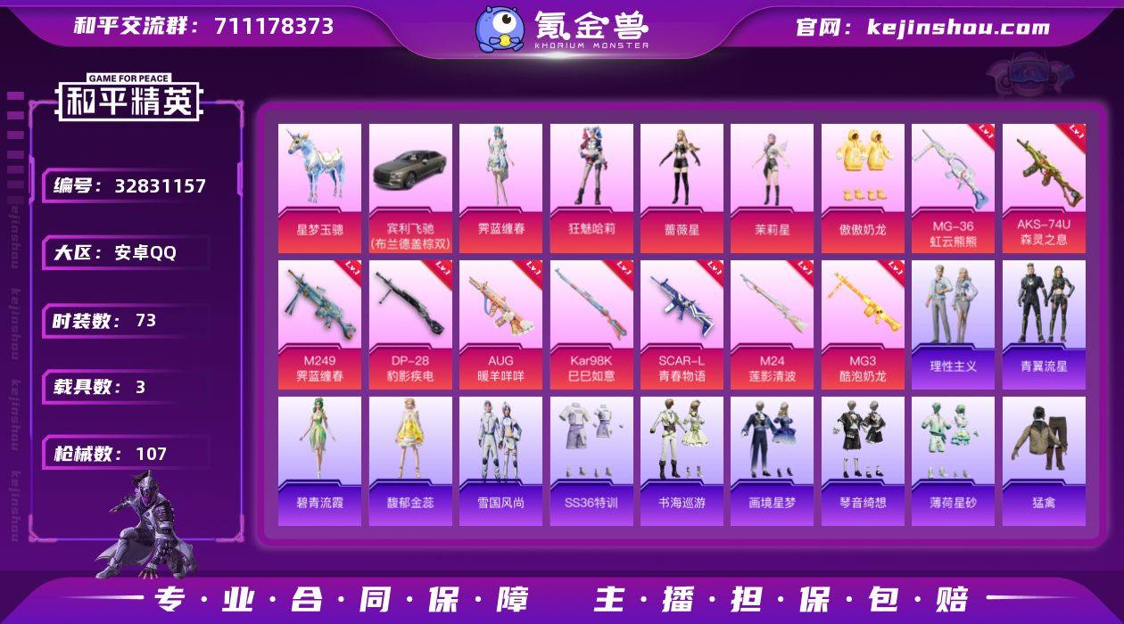 【小丑女9特效枪5粉装3载具 秒换绑不用等】 安卓Q区-34509热力值-73套装-107枪皮 【3载具】 宾利飞驰(布罗德盖棕双色) 擎天重拳 星梦玉骢【1稀有】 奇异狩猎者【5粉装】 狂魅哈莉(小丑女) 霁蓝缠春 茉莉星 蔷薇星 傲傲奶龙【9特效枪】 AKS-74U-森灵之息(5级) M249-霁蓝缠春(5级) MG-36-虹云熊熊(1级) M24-莲影清波(1级) SCAR-L-青春物语(6级) MG3-酷泡奶龙(4级) Kar98K-巳巳如意(5级) AUG-暖羊咩咩(5级) DP-28-豹影疾电(3级)【109热门】 白色伏地魔 SS27特训 SS26特训 SS25特训 SCAR-L-玉兔迎春 M762-天降萌叽 Mk47-乌木金纹 M249-彩虹符号 M416-蓝色火焰 GROZA-彩虹符号 破蛋小黄鸡 长空猛禽 弄潮海豚 霓虹街区 魅力单车 蓝色运动 竞技达人朋克 黄色运动 黑色伏地魔 粉红小猪 S1897-糯团青竹 平底锅-画境星梦 馥郁金蕊 冰河战士 MG-36-薄荷星砂 恋语绒绒 星影赞美诗 撬棍-冰晶雪宝 AWM-天降萌叽 大橘大利 G36C-霁蓝缠春 M200-罪夜之冕 战术弩-江南烟雨 SS21特训 SS29特训 SS30特训 ACE32-冰晶雪宝 俏兔智灵 鱼渊荷华 青翼流星 理性主义 PKM-啾咪啾咪 燕燕于飞 SS31特训 SS33特训 SS32特训 巳巳如意 蜜獾-精灵梦叶罗丽 焰鹰斗篷 SS36特训 老实芭蕉 Vector-突变脉冲 智谋强哥...