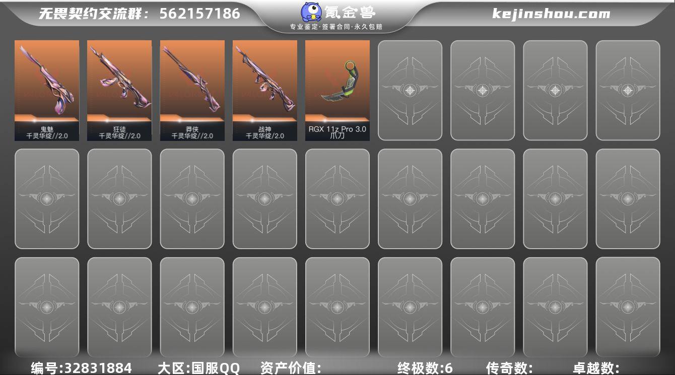 【Hww687】国服Q区 皮肤价值12720 【6橙皮 8皮肤 15英雄 19卡面 140已用源晶】 白银 优质装备:千灵华绽//2.0套装、近战武器-RGX 11z Pro//3.0 爪刀 【套装】:千灵华绽//2.0套装 【英雄】:炼狱,暮蝶,壹决,铁臂,捷风,雷兹,不死鸟,贤者,猎枭,零,芮娜,斯凯,海神,盖可,黑梦 【近战武器】:近战武器-流风回雪,近战武器-RGX 11z Pro//3.0 爪刀 【狂徒】:狂徒-千灵华绽//2.0 【莽侠】:莽侠-千灵华绽//2.0 【战神】:战神-千灵华绽//2.0 【鬼魅】:鬼魅-千灵华绽//2.0 【卡面】:代号红色 卡面,新兵报到 卡面,V契约 卡面,无畏契约 卡面 【喷漆】:胜利属于无畏契约 喷漆,GLHF 喷漆,无畏契约 喷漆 【挂饰】:无畏契约 纪念币 挂饰