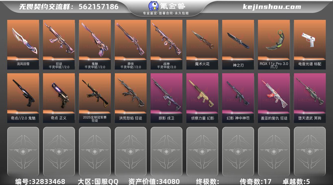 自带包赔 可赔三倍】:库存价值 34080 【限定】: 2025全球冠军赛 狂徒 【近战】: 流风回雪, 神之刃, 魔术火花, RGX 11z Pro//3.0 爪刀 【狂徒】: 千灵华绽//2.0 狂徒, 2025全球冠军赛 狂徒, 洪荒怒焰 狂徒, 盖亚的复仇 狂徒 【幻影】: 侦察力量 幻影, 神中神罚 幻影 【冥驹】: 堕天遗武 冥驹 【正义】: 奇点 正义 【戍卫】: 掠影 戍卫 【鬼魅】: 千灵华绽//2.0 鬼魅, 奇点//2.0 鬼魅 【标配】: 电音光谱 标配 【战神】: 千灵华绽//2.0 战神 【莽侠】: 千灵华绽//2.0 莽侠 【概要】: 总皮肤 69 终极0 传奇 17 卓越 5刀皮 英雄28 LV103 历史最高:黄金 当前段位:未定级 已使用 925 R点 剩余30 R点 不可二次