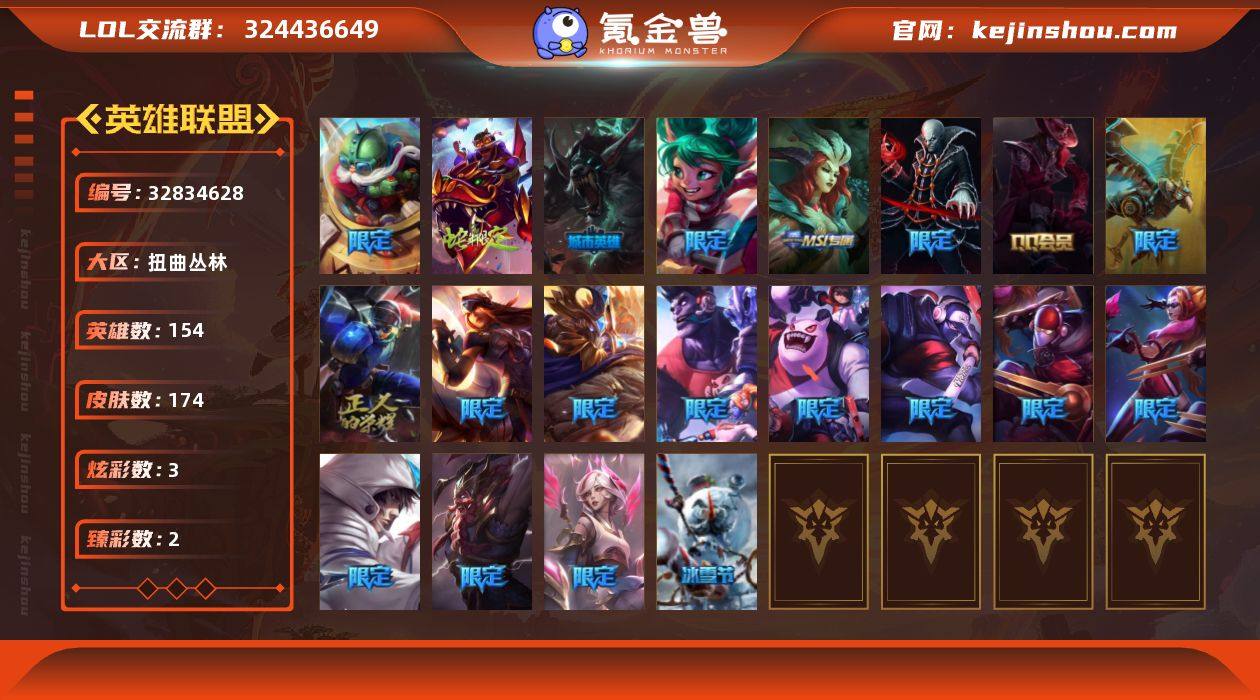 黄金段位-154英雄-174皮肤-3炫彩-0终极-0神话-27限定-8传说-50史诗 【热门头像】:卡特琳娜的匕首头像 【臻彩皮肤】:幻灵战斗猫金克丝梦幻强袭,魔女阿卡丽虚荣 【年限皮肤】:神龙之翼库奇,龙马烈焰波比 【冰雪限定】:阿木木“主人不要我了”,喜庆之树茂凯,雪默丁格,圣诞老人古拉加斯 【限定皮肤】:诺斯费拉图弗拉基米尔,暗杀星蒙多,暗杀星努努和威朗普,暗杀星慎,SKTT1劫,SKTT1婕拉,SSW泰隆,SKTT1奥拉夫,T1奥莉安娜,胜利女神希维尔,胜利之树茂凯,南瓜头费德提克,鬼影重重魔腾,外星装甲库奇,暗影沃里克,波比的巧克力工坊,永恒之森乐芙兰,钢铁之翼艾尼维亚,红桃杰克崔斯特,防暴天使凯尔 【传说皮肤】:魔幻卡牌崔斯特,源计划林易,烈焰雄心崔丝塔娜,鬼魂新娘莫甘娜,战地巨兽科加斯,女主播迦娜,丧尸布兰德,第三类接触黑默丁格 【史诗皮肤】:安伯斯与提妮,科学怪熊的新娘安妮,摄魂男爵弗拉基米尔,圣光审判凯尔,战争机器赛恩,战场公主希维尔,月光女神阿忒弥斯索拉卡,圣洁化身索拉卡,兔宝宝提莫,狼外婆沃里克,荒野豺狼沃里克,百夫长贾克斯,熔火之心拉莫斯,飞越疯人院萨科,武动巅峰萨科,海克斯科技迦娜,寒冰女皇迦娜,特种部队普朗...