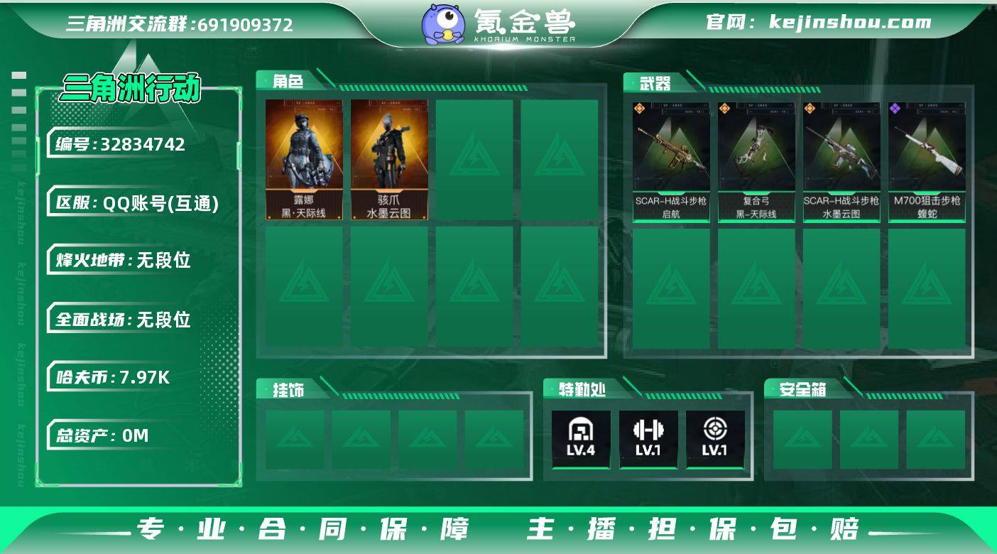 总资产(M):9M/哈夫币(K):7976K/哈夫币(K):7976K/传说枪皮数:8/全面战场等级:1_段位:无段位/烽火地带等级:15_段位:青铜/露娜-黑·天际线/骇爪-水墨云图/蛊-能天使午夜邮差/黑鹰/SCAR-H战斗步枪-水墨云图/SCAR-H战斗步枪-启航/Vector冲锋枪-能天使-午夜邮差/勇士冲锋枪-能天使-午夜邮差/M14射手步枪-缄花/SR-25射手步枪-缄花/.357左轮-缄花/复合弓-黑-天际线/SV-98狙击步枪-囚徒/M700狙击步枪-蝮蛇/K416突击步枪-碳纤维/SG552突击步枪-2026/AK-12突击步枪-零点/SCAR-H战斗步枪-荣耀列队/SMG-45冲锋枪-幻影结构/SVD狙击步枪-战术行动/M4A1突击步枪-高雅黑/M4A1突击步枪-海色/QBZ95-1突击步枪-海浪/QBZ95-1突击步枪-2026/SCAR-H战斗步枪-数码迷彩/PTR-32突击步枪-黄蜂/MP5冲锋枪-安全工作/MP5冲锋枪-黄蜂/UZI冲锋枪-海色/野牛冲锋枪-高雅黑/QCQ171冲锋枪-三角洲力量/M1014霰弹枪-高雅黑/M1014霰弹枪-海浪/M249轻机枪-黄蜂/QJB201轻机枪-三角洲力量/SR-25射手步枪-黄蜂/沙漠之鹰-海浪/G17-2026/轮式突击炮-荣耀/挂饰-阿萨拉喷火兵/挂饰-能天使/挂饰-黑/挂饰-阿萨拉狙击兵/挂饰-阿萨拉霰弹兵/挂饰-诡影狙击兵/挂饰-诡影喷火兵/挂饰-崩岩重炮/挂饰-暗行哨兵/挂饰-福禄/挂饰-聚...