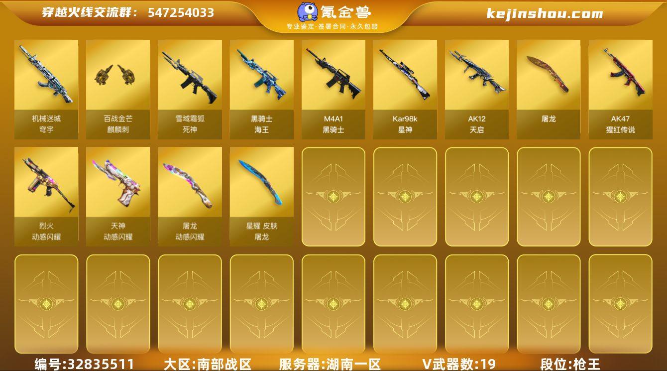 【ky6143】湖南一区-20V-3王者武器数-0炫金武器数 【热门武器】:修罗-古蛇迷踪,Kar98K-星神,M4A1-黑骑士 【音效卡】:M4A1-黑骑士音效卡,Kar98K-星神音效卡,死神-雪域霜狐-怀旧音效卡 【皮肤】:M4A1-再燃火线,屠龙-星耀 皮肤,轻型军用手斧-再燃火线 【角色】:零·纪元,雪域霜狐,蛇隐宗,乔伊教练,葵-阿尔法武装,暗夜-X,初恋灵狐,电竞少女,风暴女*2,灵狐者-职业经理,曼陀罗-X,潘多拉-甜心教官,潜龙队-X,蛇姬,兔囡囡 【人偶武器】:迷你牛牛,生化手雷-机甲核心,灵狐娃娃手雷 【挑战大师】:AK47-冰龙粉碎者,神圣爆裂者-末日III 【英雄级武器】:M4A1-黑骑士,AK12-天启,死神-雪域霜狐,烈火-动感闪耀,AK-47-猩红传说,黑骑士-海王*2,机械迷城-穹宇,Kar98K-星神,天神-动感闪耀,修罗-古蛇迷踪,屠龙,屠龙-动感闪耀,麒麟刺-百战金芒,手雷-动感闪耀,高爆手雷-古蛇迷踪,闪光弹-雷暴王者*2,烟雾弹-古蛇迷踪,烟雾弹-雷暴王者,M4A1-赤狱骑士 【道具】:云山科技背包,亚洲杯纪念炫彩背包,百战金芒炫彩背包,超级背包,女皇终结者-魔龙之吻,救世主-黑桃战神,绿色巨人,灵魂忍者,迷雾幽灵,生化弹匣,夺命之镰,防化服*3,金色流光-枪王排位*2...