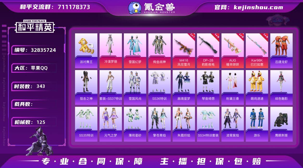 漂亮公主素材号/歼灭大师【雪国/珣金战神/金鞋】暗影哥特/冷漠罗丽/满级m4风花雪月/满级aug/雪国全套背包/地铁满天赋 实名: 可修改 时装数: 343 枪械数: 125 战备数: 99 热门装扮: 鹰眼刺客,绚金战神,雪国幻梦,派对舞王,冷漠罗丽 稀有枪皮: M416风花雪月,Kar98K-巳巳如意,AUG-暖羊咩咩,DP-28-豹影疾电