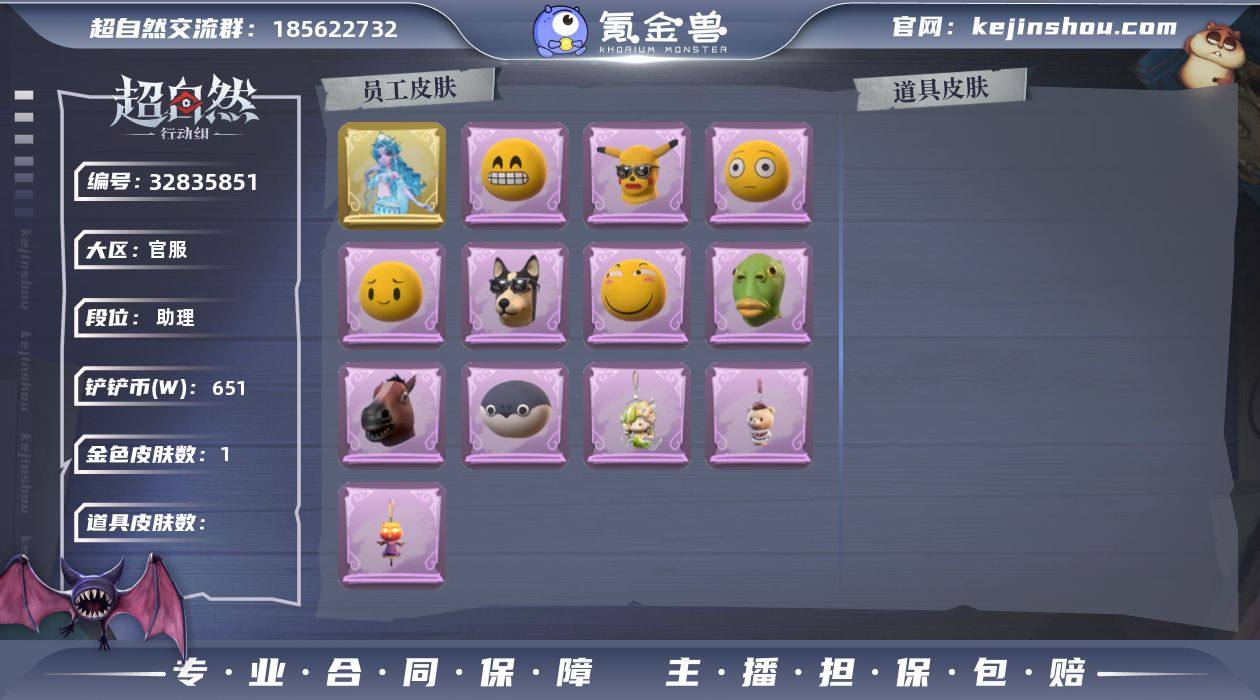 金色皮肤数量: 1 段位: 助理 员工: 莉莉 外观: 嘻嘻头套,烈焰红唇头套,呆滞头套,卑微头套,哈士奇头套,滑稽头套,鱼头怪头套,面具马头套,萨卡班甲鱼头套,糖果守卫,晚安小熊,海月息潮,桂冠聆诗 亮点: 【Hcz805】【特价秒杀】:金皮1,紫皮0,道具0,累充36元,金砖6,铲铲币65.1万,(海月息潮)金皮1;皮肤:薇薇安-海月息潮;饰品:头饰-呆滞头套,头饰-萨卡班甲鱼头套,头饰-嘻嘻头套,头饰-烈焰红唇头套,头饰-鱼头怪头套,头饰-哈士奇头套,头饰-滑稽头套,头饰-面具马头套,头饰-卑微头套,头饰-像素朋克墨镜,头饰-后室幸存者头套,挂饰-桂冠聆诗,挂饰-糖果守卫,挂饰-晚安小熊;动作:动作-新年摇,动作-举牌,动作-抬手;工牌背景:工牌背景-鸢尾花,工牌背景-甜心的囚笼,工牌背景-甜酷指令;工牌动作:工牌动作-鸦影,工牌动作-轻躯鹤立;员工:莉莉,员工-薇薇安,员工-零,员工-小黄,员工-爱丽丝;累充36元;铲铲币65.1万;金砖6;段位:助理Ⅰ;魔盒等级:32;【巨人官方账号(唯一渠道)】【官方截图】