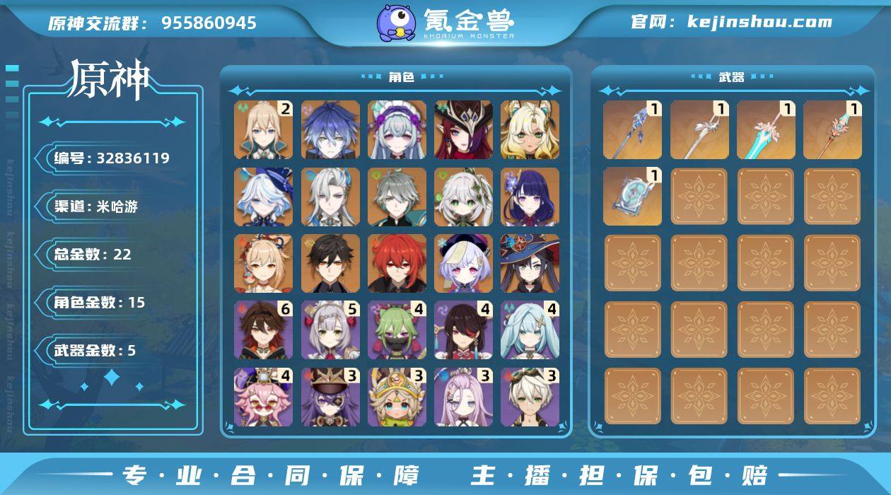 邮箱: 未绑定 总黄数: 22 冒险等级: 57 2命金色角色: 二命琴 0命金色角色: 迪卢克,宵宫,七七,钟离,莫娜,雷电将军,纳西妲,艾尔海森,那维莱特,芙宁娜,希诺宁,恰斯卡,梦见月瑞希,菲林斯 拥有武器: 四风原典,天空之傲,风鹰剑,天空之脊,血染荒城 1精武器: 四风原典,天空之傲,风鹰剑,天空之脊,血染荒城